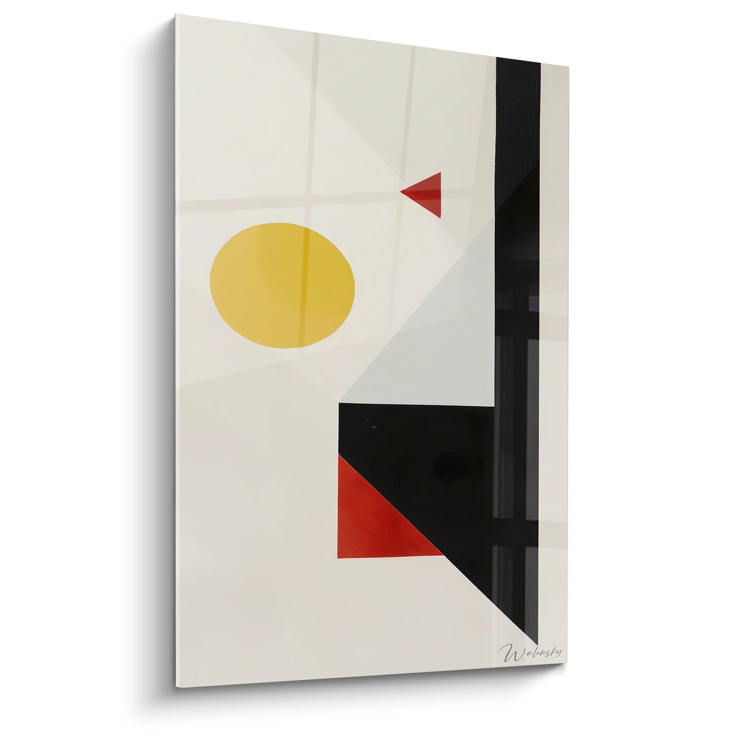 Ce tableau géométrique abstrait présente une composition sophistiquée qui allie formes pures et couleurs vibrantes dans un équilibre parfait. L'œuvre se structure autour d'un cercle jaune dominant, symbole d'énergie et de lumière, qui dialogue harmonieusement avec des triangles rouges aux angles précis. La composition abstraite moderne intègre également des éléments rectangulaires noirs qui apportent une dimension graphique forte et contrastée. Les formes géométriques se chevauchent et interagissent sur un fond blanc épuré, créant une dynamique visuelle captivante. Ce tableau mural géométrique exploite magistralement les principes de l'art constructiviste, où chaque élément trouve sa place dans une architecture visuelle rigoureuse. Les formes géométriques colorées semblent flotter dans l'espace, créant un jeu de profondeur subtil grâce aux superpositions calculées. Cette œuvre d'art abstraite contemporaine s'inscrit dans la tradition des maîtres du mouvement géométrique tout en proposant une interprétation moderne et accessible. L'artiste a su créer une décoration murale design qui fonctionne aussi bien dans un environnement résidentiel que professionnel, apportant une touche de sophistication et de modernité.