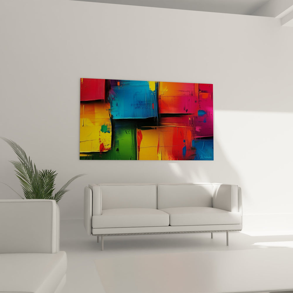 Ce tableau mural abstrait présente une composition géométrique saisissante où les formes rectangulaires se chevauchent dans une danse chromatique exceptionnelle. L'œuvre révèle un agencement sophistiqué de blocs colorés aux contours nets, créant un effet de profondeur et de mouvement qui captive immédiatement le regard. Les formes géométriques colorées s'articulent autour de sections distinctes : des zones bleues profondes contrastent avec des segments jaunes éclatants, tandis que des plages rouges et orangées apportent une chaleur dynamique à l'ensemble. Cette peinture abstraite moderne exploite la technique de la superposition pour générer des transparences subtiles et des jeux d'ombres qui enrichissent la perception visuelle. Les tableaux muraux géométriques contemporains de ce style transforment l'espace en créant un point focal puissant. L'artiste a privilégié une approche structurée où chaque couleur occupe un territoire défini tout en dialoguant harmonieusement avec les teintes adjacentes, créant ainsi une œuvre d'art abstrait géométrique d'une rare intensité expressive.