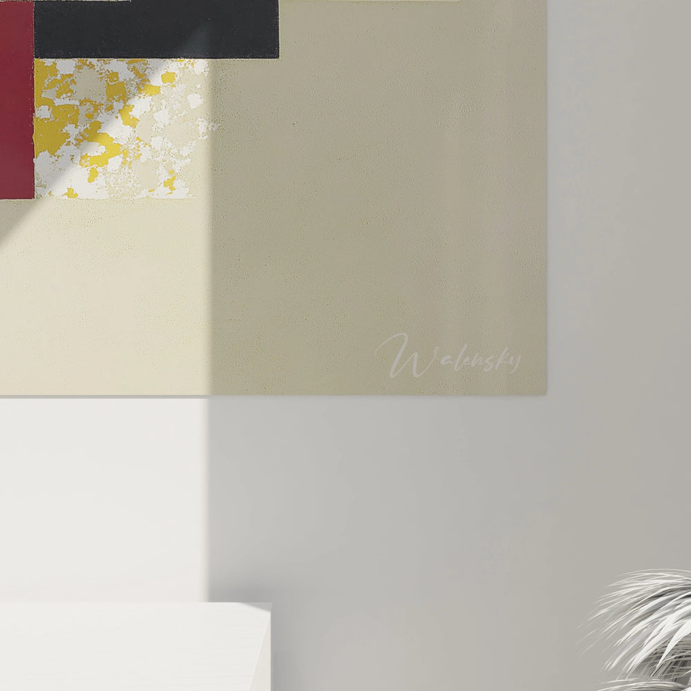 La structure de cette tableau composition géométrique contemporaine s'organise autour d'un système de lignes directrices invisibles qui guident le regard à travers l'œuvre. Les formes rectangulaires se positionnent selon des angles précis, créant des points de tension visuelle stratégiquement placés. L'équilibre général repose sur une distribution asymétrique qui génère un dynamisme constant. Cette œuvre géométrique moderne exploite la règle des tiers de manière non conventionnelle, plaçant les éléments principaux selon des rapports proportionnels sophistiqués. La perspective reste frontale mais les superpositions créent une illusion de profondeur subtile. L'espace négatif beige joue un rôle crucial dans la respiration visuelle de l'ensemble.