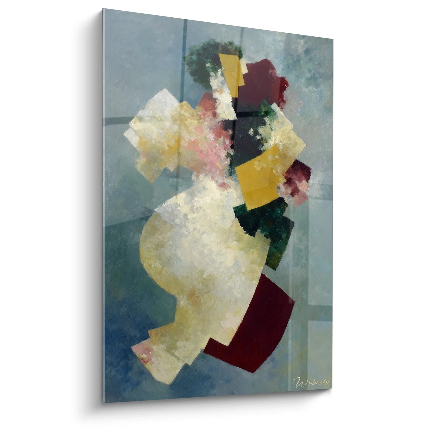 Ce tableau composition abstraite se distingue par son assemblage dynamique de formes géométriques flottant dans un espace atmosphérique gris-bleu. L'œuvre présente une explosion contrôlée de couleurs vives - jaunes éclatants, rouges profonds et verts intenses - qui créent un dialogue visuel saisissant. Cette décoration murale composition géométrique capture immédiatement l'attention par son équilibre entre chaos apparent et harmonie subtile. Les formes rectangulaires et carrées de différentes tailles semblent danser dans l'espace, créant une sensation de mouvement perpétuel. L'artiste a magistralement orchestré cette symphonie visuelle où chaque élément coloré trouve sa place dans cette composition abstraite contemporaine.