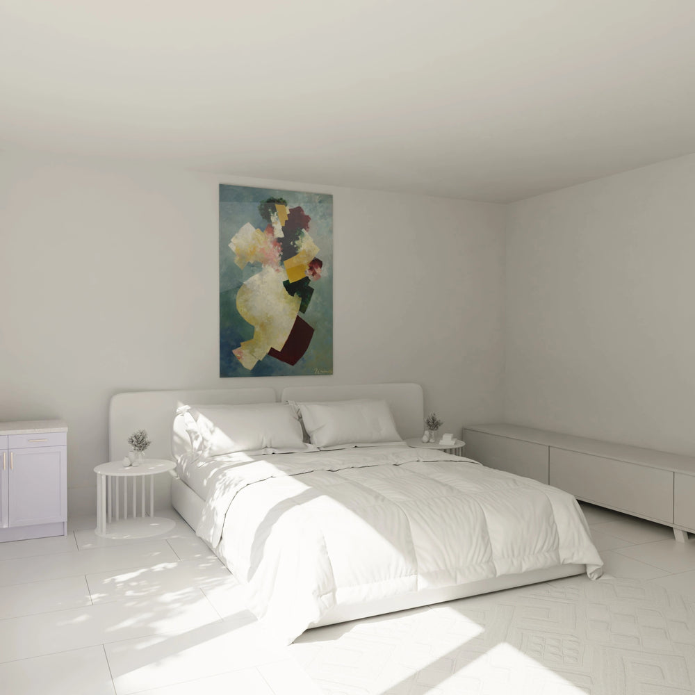 Ce tableau composition abstraite géométrique se démarque par son équilibre parfait entre simplicité formelle et complexité émotionnelle. L'originalité réside dans cette capacité à créer du mouvement avec des formes statiques, générant une dynamique visuelle hypnotique. Les proportions non conventionnelles des éléments géométriques créent une signature artistique distinctive.