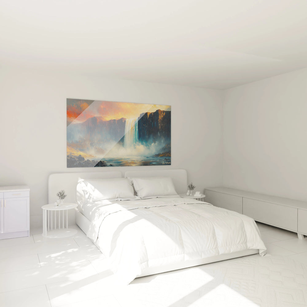 Le tableau cascade présente une impressionnante chute d'eau se déversant d'une falaise escarpée, baignée dans une lumière dorée crépusculaire. Cette œuvre saisissante capture l'instant où l'eau rencontre l'atmosphère, créant un voile de brume éthéré à sa base. La composition équilibrée juxtapose harmonieusement la solidité des formations rocheuses sombres et la fluidité de l'eau qui s'écoule, tandis que le ciel embrasé offre un arrière-plan spectaculaire qui illumine l'ensemble de la scène.