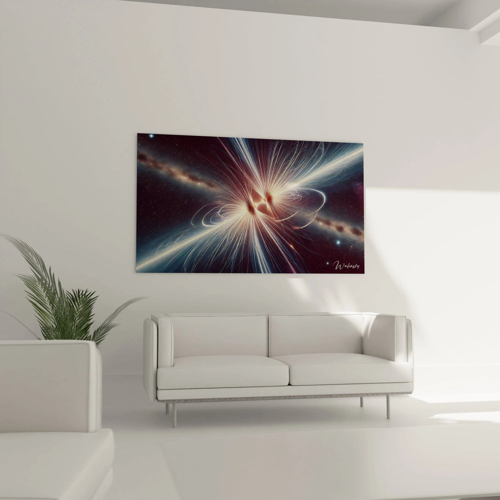 Créé à partir d’une inspiration puisée dans les phénomènes naturels tels que les aurores boréales et la danse silencieuse des particules, ce tableau est une véritable célébration des forces invisibles qui gouvernent le cosmos. Il trouve sa place dans la lignée des grandes œuvres abstraites, où émotion et science s’entrelacent avec finesse.