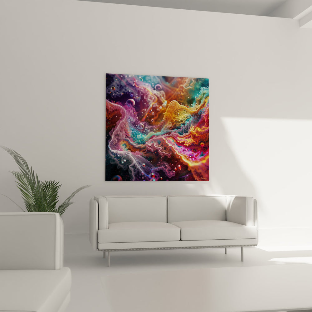 Cette œuvre d'art tableau mural neuronal présente une vision spectaculaire des connexions synaptiques sous forme cosmique et abstraite. L'image révèle un univers microscopique où les réseaux de neurones se transforment en galaxies colorées, créant un pont visuel entre la science et l'art contemporain. Les formes organiques ondulent comme des synapses en activation, baignées dans un kaléidoscope de teintes iridescentes allant du violet profond aux oranges chaleureux, en passant par des bleus cyan lumineux. Ce tableau décoratif cerveau capture l'essence même de l'activité cérébrale à travers des bulles flottantes qui évoquent les neurotransmetteurs en mouvement. Les textures fluides et les effets de lumière créent une représentation artistique système nerveux d'une beauté saisissante. Chaque détail de cette œuvre d'art neurobiologie invite à la contemplation des mystères de l'esprit humain, transformant la complexité scientifique en une expérience esthétique immersive. Cette décoration murale neurosciences s'intègre parfaitement dans les intérieurs modernes, apportant une dimension intellectuelle et artistique unique à votre espace de vie.