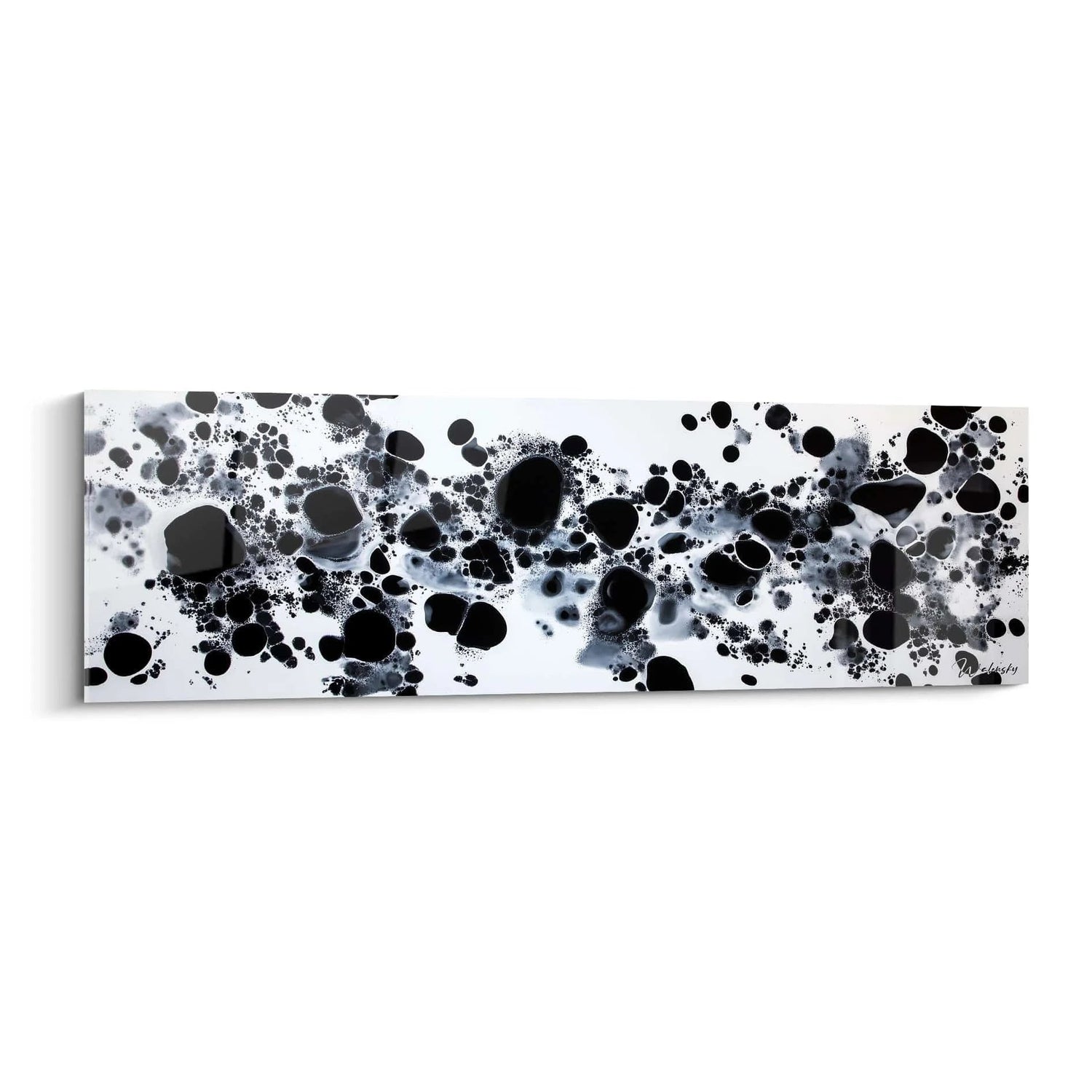 La composition de ce tableau éclaboussures abstraites contemporain s'organise selon une répartition apparemment chaotique mais équilibrée. Les projections principales se concentrent vers le centre-gauche, créant un point focal naturel qui guide le regard. Les éclaboussures de grande taille ancrent visuellement l'œuvre tandis que les petites projections périphériques créent un rythme visuel dynamique. Le format panoramique horizontal amplifie la sensation de mouvement latéral, comme une vague d'encre traversant l'espace. Cette art mural éclaboussures utilise intelligemment l'espace négatif blanc pour faire respirer la composition et accentuer l'impact des éléments noirs. La perspective plane maintient l'attention sur la gestuelle artistique pure.