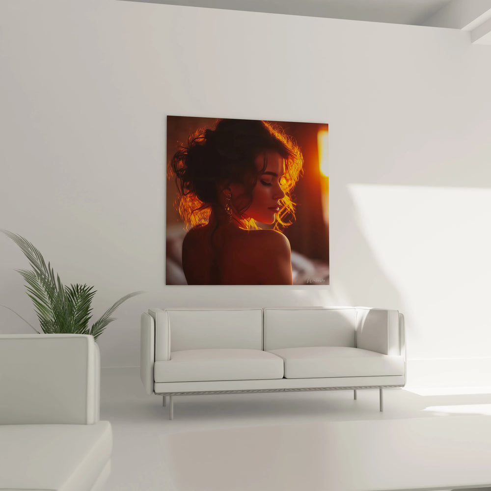 Ce tableau mural beauté féminine représente un portrait artistique d'une beauté féminine saisissante, capturé dans un moment d'intimité contemplative. L'œuvre met en scène une femme élégante de profil, ses traits délicats sculptés par un éclairage dramatique aux tons chauds. Sa chevelure ondulée encadre harmonieusement son visage, créant des mouvements fluides qui semblent danser dans la lumière dorée ambiante. Les jeux d'ombres et de lumières révèlent la finesse de ses traits, depuis la courbe gracieuse de son nez jusqu'à la douceur de ses lèvres entrouvertes. Ses yeux mi-clos évoquent un état de méditation sereine, ajoutant une dimension spirituelle à cette représentation artistique. La palette chromatique dominée par les oranges chaleureux, les dorés lumineux et les cuivrés profonds crée une atmosphère enveloppante et passionnée. Cette œuvre d'art murale contemporaine transforme l'espace en sanctuaire de beauté, où chaque regard porté sur ce portrait féminin profil révèle de nouveaux détails subtils. La technique artistique utilisée sublime la peau veloutée de la femme, créant des contrastes saisissants avec l'arrière-plan flou qui concentre toute l'attention sur le sujet principal de cette décoration murale élégante.