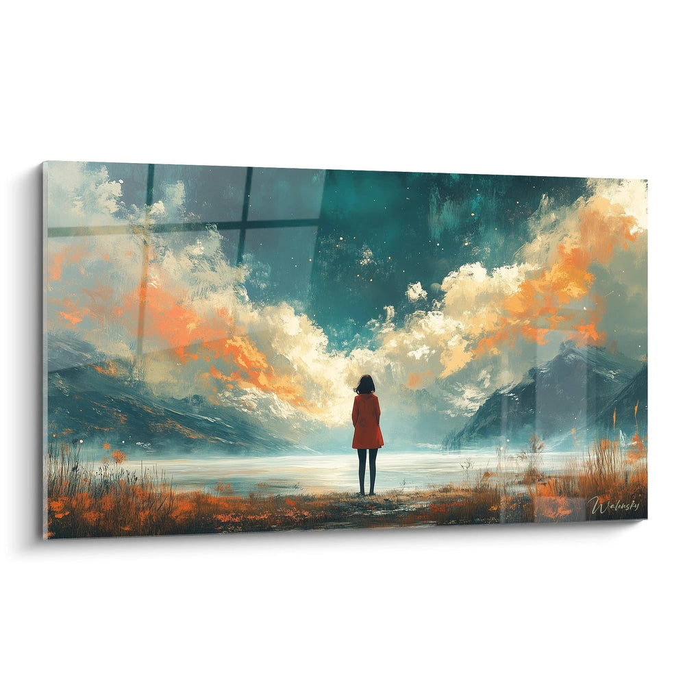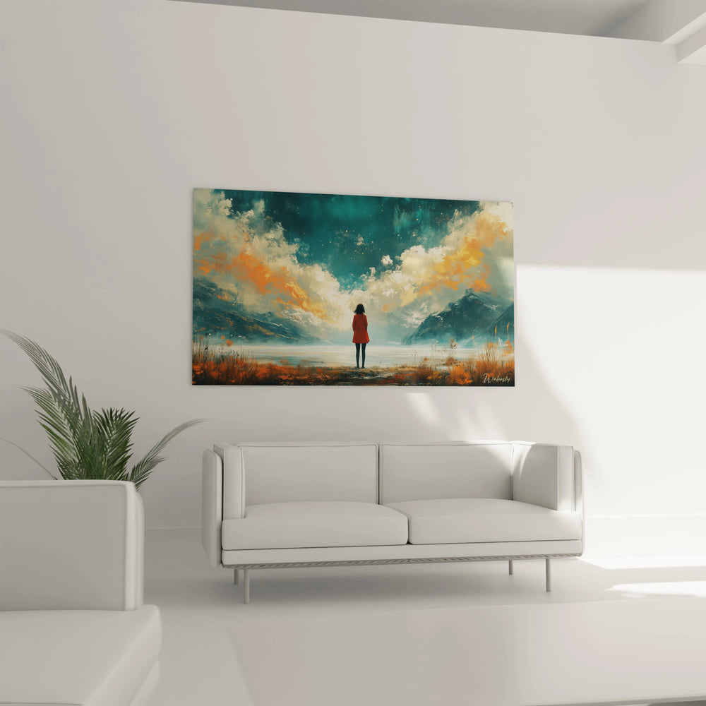 Ce tableau paysage contemplatif saisit l'essence d'un moment de connexion profonde avec la nature. Une silhouette féminine vêtue d'un manteau rouge vif se tient face à un panorama montagneux spectaculaire. L'impression première est celle d'une immersion totale dans un univers où le ciel embrasé dialogue avec des montagnes majestueuses. La figure solitaire, centrée dans la composition, crée immédiatement un point d'ancrage émotionnel pour le spectateur de ce tableau paysage méditatif.