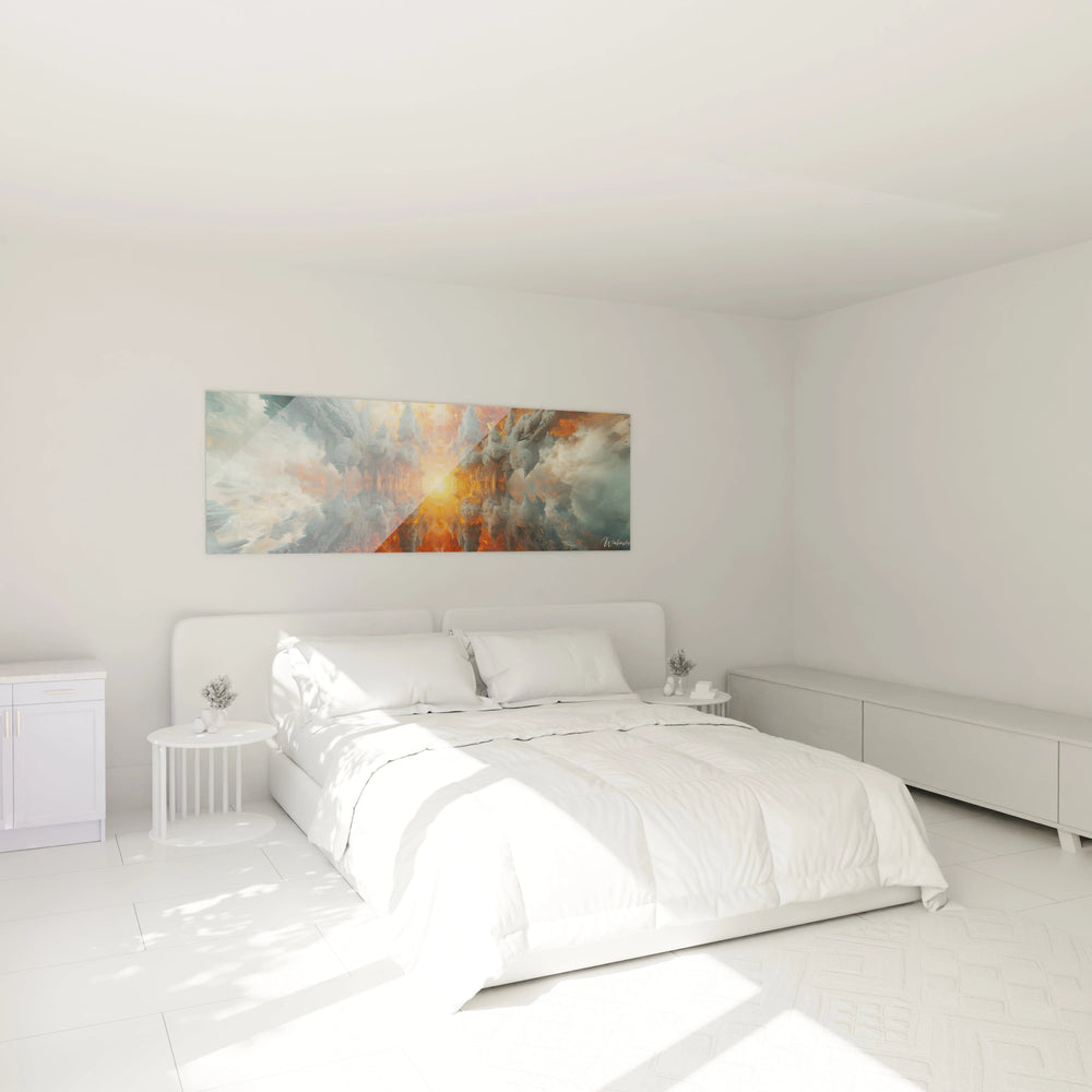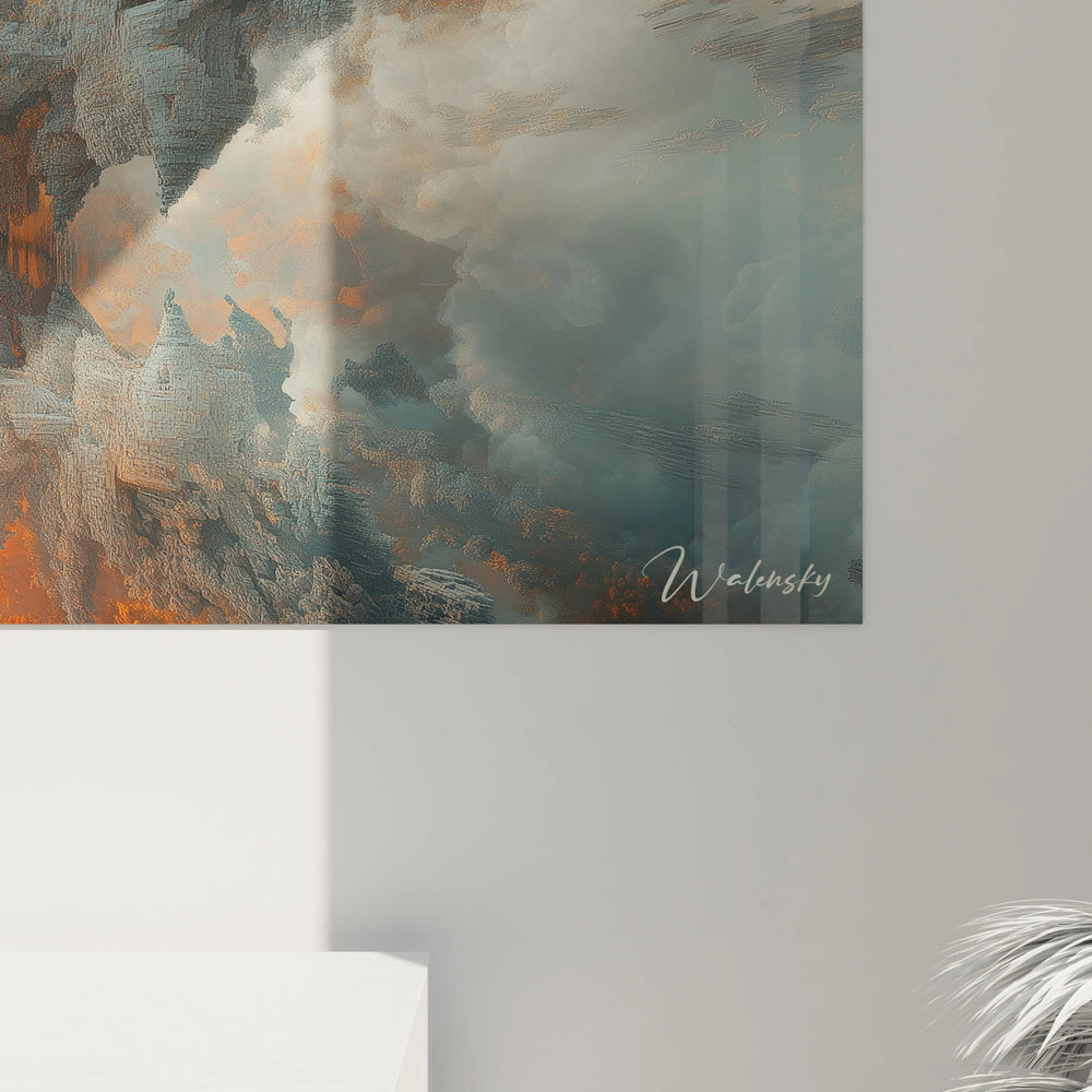 Ce tableau paysage nuageux spectaculaire dévoile une richesse texturale remarquable à travers ses différentes surfaces. Les formations rocheuses présentent des textures rugueuses et minérales, contrastant avec la fluidité vaporeuse des nuages. L'explosion centrale révèle des effets de lumière sophistiqués, avec des gradients subtils qui créent une profondeur hypnotique. Cette décoration murale géologique mystique utilise des techniques de superposition et de transparence pour obtenir ces effets atmosphériques saisissants. Les jeux d'ombre et de lumière sculptent chaque élément, donnant une dimension tridimensionnelle à l'ensemble et créant une sensation de mouvement perpétuel dans cette composition statique.