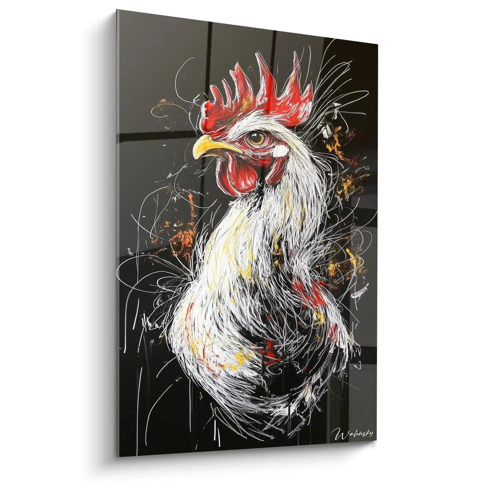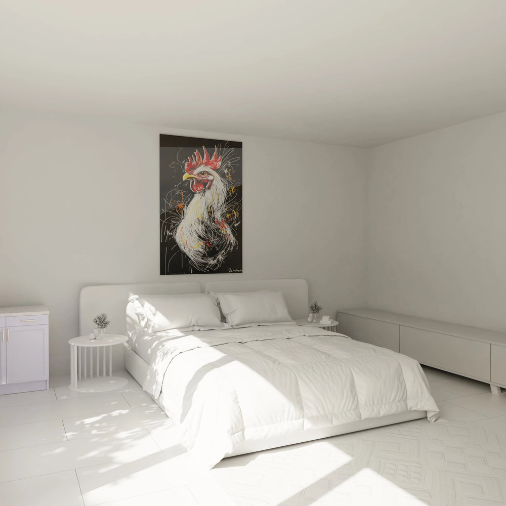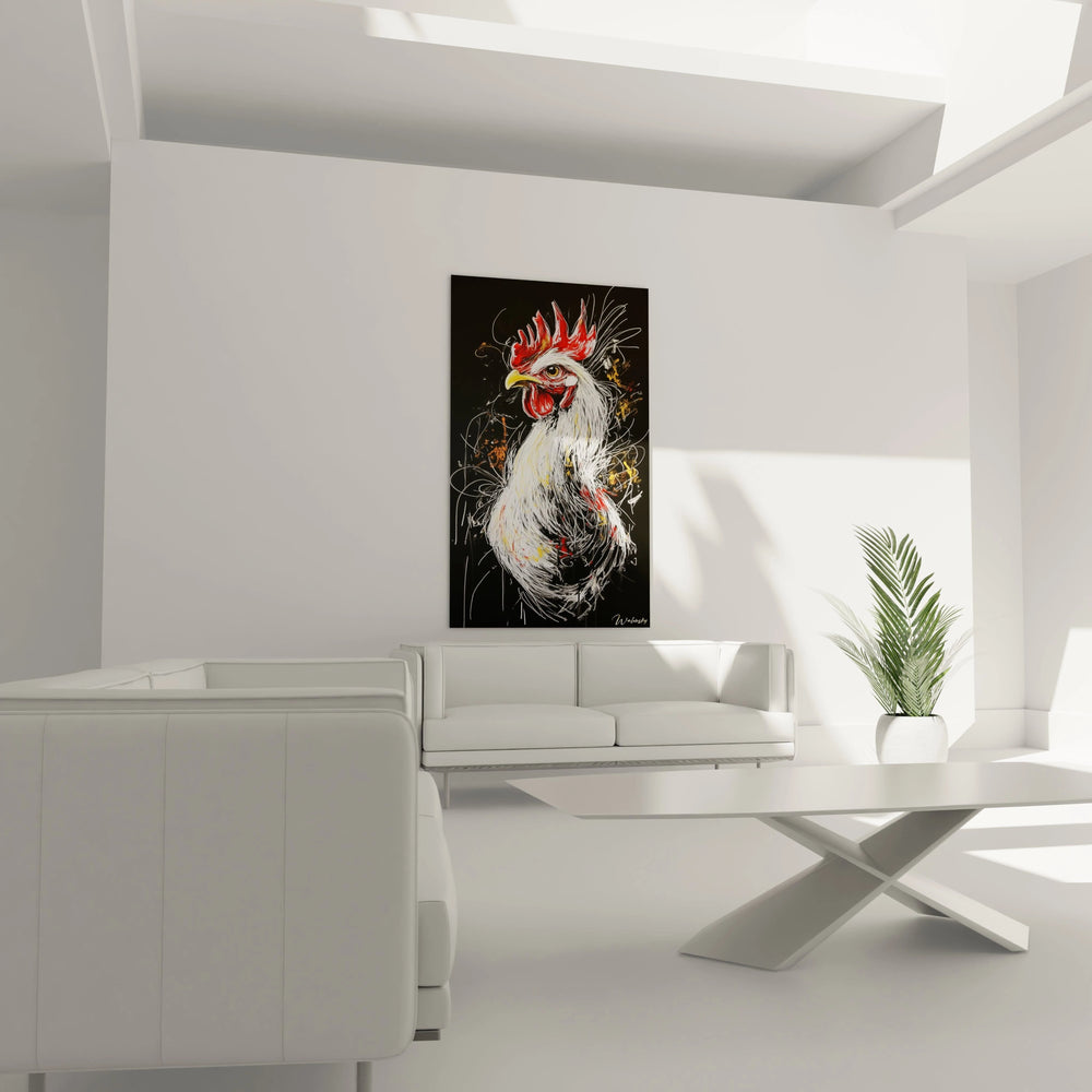 Ce tableau ne se contente pas de décorer, il éveille une véritable émotion. Le coq, dressé dans une posture fière et alerte, impose sa présence avec une vigueur palpable. Chaque trait expressif, chaque nuance soigneusement choisie, vous transporte dans un univers où l’énergie matinale et l’élan vital dominent. Le fond noir profond met en lumière le plumage éclatant, blanc comme la lumière naissante, tandis que les éclats rouges et dorés évoquent un feu intérieur, symbole de passion et de puissance.