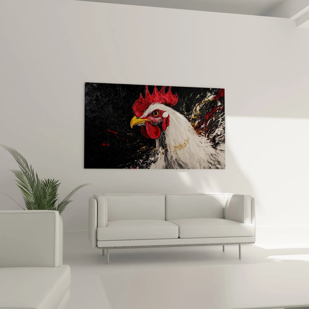 Ce tableau coq captivant présente un portrait saisissant d'un coq blanc au regard perçant sur un fond noir intense. L'œuvre se distingue immédiatement par son extraordinaire rendu texturé et expressif qui donne vie au sujet. La crête rouge flamboyante du gallinacé se dresse fièrement au sommet de sa tête, créant un contraste dramatique avec le plumage blanc éclatant et le fond sombre qui l'entoure. Les coups de pinceau énergiques et audacieux créent un effet dynamique, comme si le coq allait s'animer à tout instant.