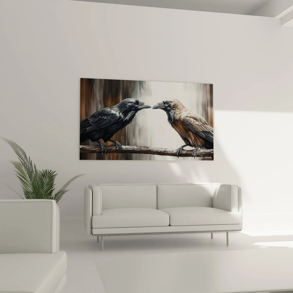 La composition de ce tableau corbeau face à face repose sur un équilibre parfait entre les deux sujets principaux. Positionnés symétriquement de part et d'autre du centre, les corbeaux créent une tension visuelle captivante qui guide naturellement le regard vers leur point de rencontre. La branche rugueuse qui les supporte traverse horizontalement l'œuvre, servant de ligne directrice stable qui ancre la composition. L'arrière-plan flou aux tons neutres permet aux sujets de ressortir avec une netteté saisissante. Cette perspective frontale offre une intimité rare avec ces créatures habituellement observées de loin, transformant ce tableau corbeau proximité intense en une expérience visuelle immersive unique.