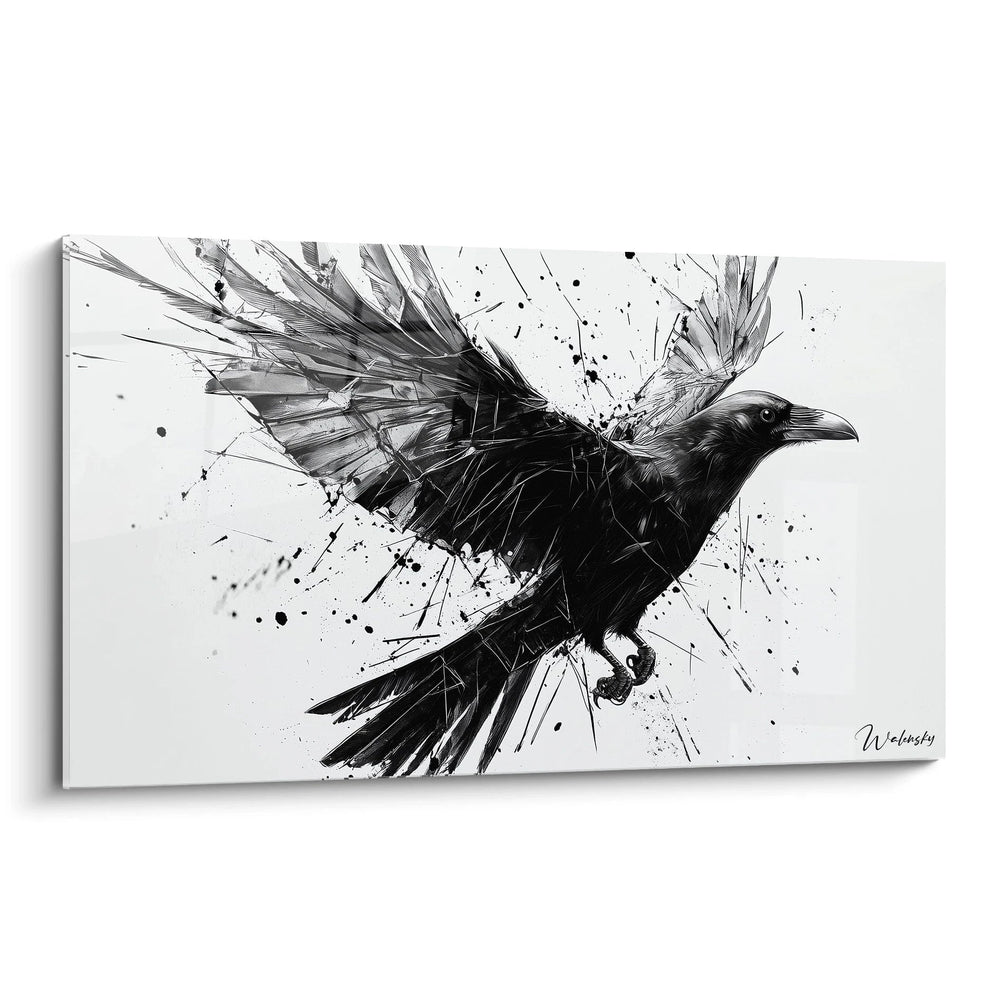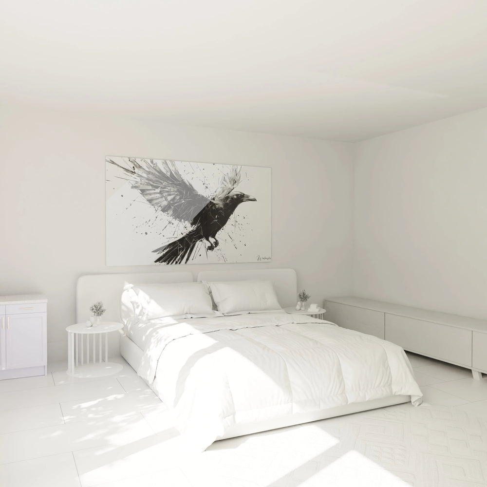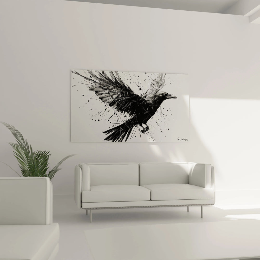 Le design de ce tableau emprunte au mouvement expressif et contemporain, où chaque trait précis du corbeau se mêle à des projections d’encre semblant éclater avec vitalité autour de lui. Cette tension dynamique entre la maîtrise du détail et la liberté floue des éclaboussures évoque la dualité fascinante de cet oiseau : robuste mais fragile, tangible mais insaisissable.
