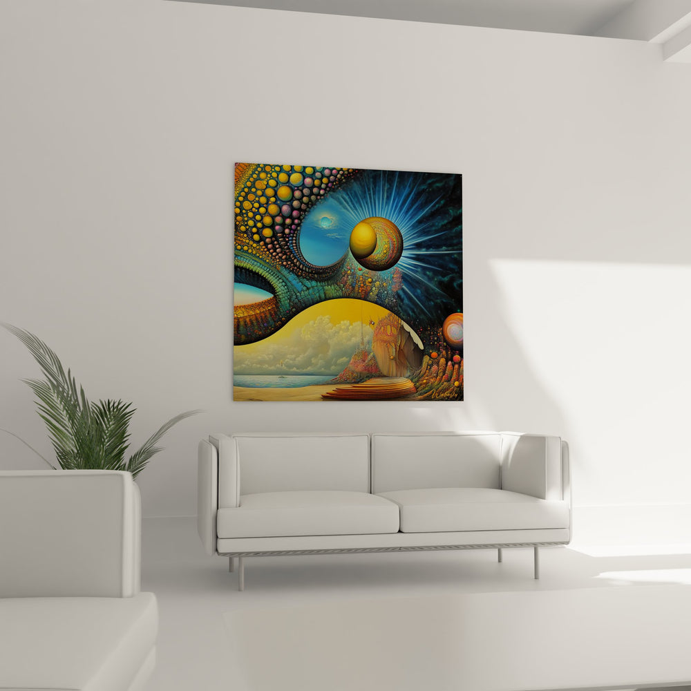 Ce tableau surréaliste abstrait présente une vision fascinante d'un cosmos mystique où se mélangent réalité et imaginaire. L'œuvre révèle un portail dimensionnel spectaculaire au centre de la composition, d'où émergent des rayons lumineux bleus électriques qui transpercent l'espace. La partie gauche du tableau mural cosmos déploie une mosaïque hypnotique de sphères dorées et multicolores, créant un effet de profondeur infinie caractéristique de l'art surréaliste contemporain. Ces orbes semblent flotter dans un espace-temps déformé, évoquant les théories quantiques et les dimensions parallèles. Au premier plan, une plage dorée aux tons chauds contraste avec l'univers cosmique, tandis qu'un bateau solitaire navigue sur une mer tranquille, symbolisant le voyage de l'âme vers l'inconnu. Cette décoration murale surréaliste transforme l'espace en portail vers d'autres dimensions, où l'architecture impossible se mêle aux éléments naturels. Les formations rocheuses texturées révèlent des motifs géométriques complexes, rappelant les fractales et les structures cristallines. L'ensemble compose une œuvre d'art abstrait moderne qui interroge notre perception de la réalité et invite à l'exploration des mondes parallèles.
