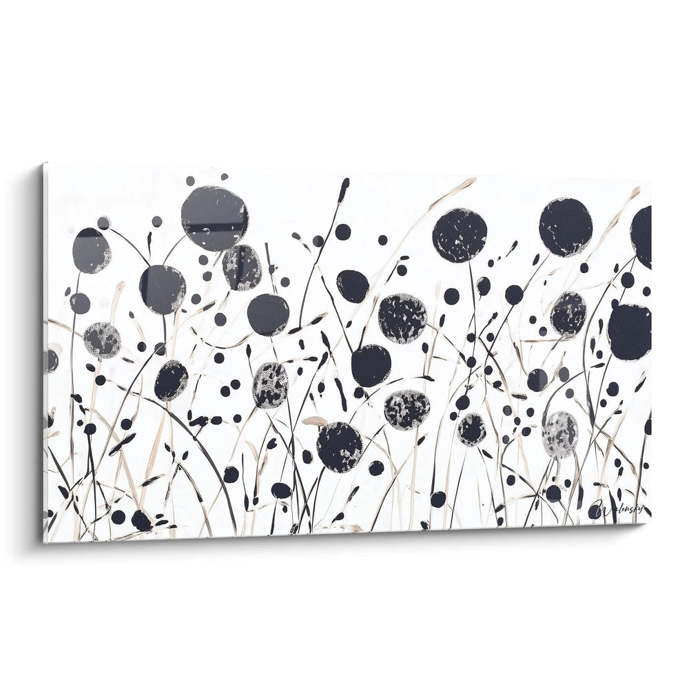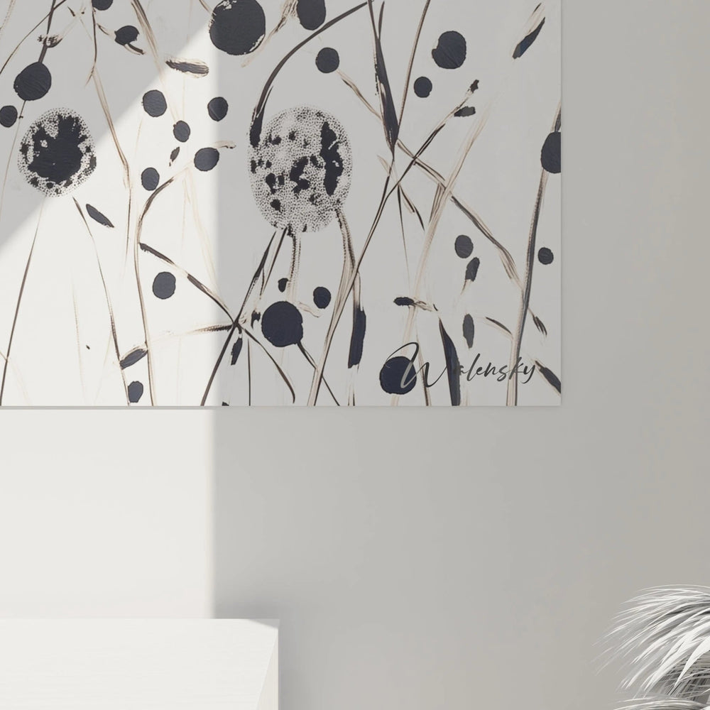 Ce tableau fleurs sauvages présente une composition artistique remarquable où dominent des formes circulaires noires aux textures variées, évoquant des graines et des têtes de fleurs dispersées naturellement. L'œuvre se distingue par son approche minimaliste moderne, où chaque élément semble danser sur la surface blanche immaculée. Cette décoration murale florale contemporaine capture l'essence même de la nature sauvage à travers un prisme artistique épuré. Les tiges fines et élancées s'entrecroisent délicatement, créant un réseau organique qui guide le regard à travers l'ensemble de la composition. Cette œuvre végétale minimaliste transforme immédiatement l'atmosphère d'un espace grâce à son élégance naturelle.