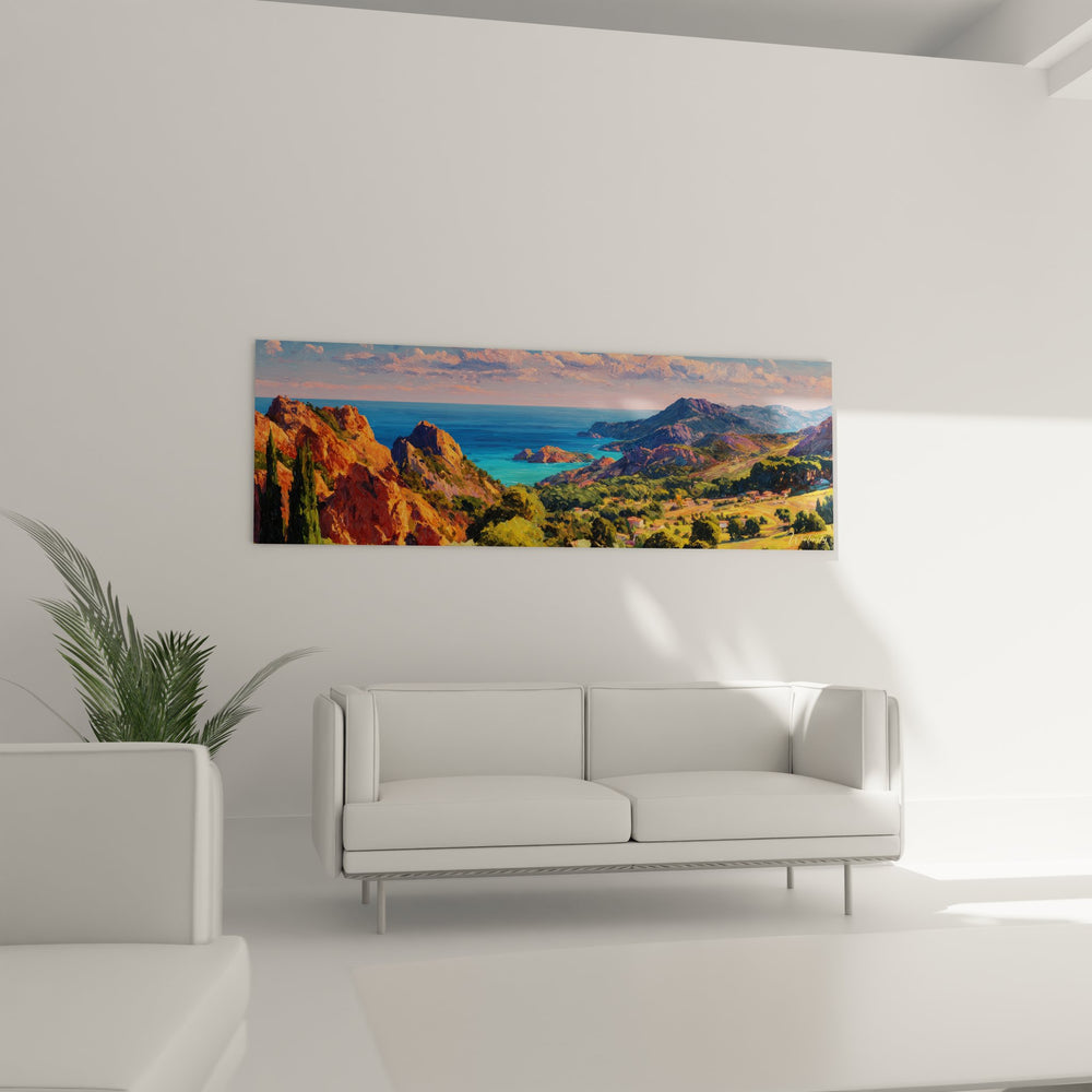 Ce tableau mural côte méditerranéenne offre une vue spectaculaire sur un paysage côtier baigné de lumière dorée. La composition présente au premier plan des formations rocheuses aux teintes ocre et orange, sculptées par le temps et illuminées par les rayons du soleil couchant. Ces rochers méditerranéens contrastent magnifiquement avec la mer turquoise qui s'étend à l'infini vers l'horizon. La végétation luxuriante, composée de cyprès élancés et de maquis verdoyant, apporte une note de fraîcheur à cette scène maritime panoramique. Au loin, les collines ondulantes révèlent un paysage côtier méditerranéen authentique, ponctué de petites habitations blanches qui témoignent de la présence humaine harmonieusement intégrée dans ce décor naturel. Ce tableau bord de mer panoramique capture l'essence même du littoral méditerranéen avec ses couleurs chaudes et sa lumière exceptionnelle. Les nuances subtiles du ciel, oscillant entre le rose et le bleu pastel, renforcent l'atmosphère sereine de cette vue mer depuis les falaises. Cette œuvre d'art maritime transformera votre intérieur en véritable fenêtre ouverte sur la Méditerranée.