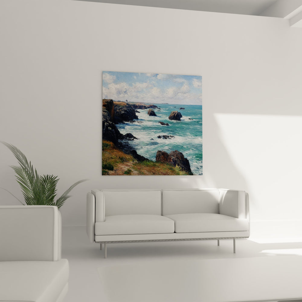 Cette œuvre remarquable capture avec une intensité saisissante la beauté sauvage d'une côte rocheuse bretonne battue par les flots. Le tableau mural paysage marin dévoile un panorama côtier où les falaises de granite sombre se dressent majestueusement face à l'océan tumultueux. Les rochers sculptés par l'érosion émergent des eaux turquoise comme des sentinelles ancestrales, témoins de la puissance éternelle de la mer. L'artiste a magistralement rendu la texture rugueuse des falaises bretonnes en utilisant une technique impressionniste qui fait vibrer chaque coup de pinceau. Au loin, on distingue un phare solitaire qui veille sur cette côte sauvage atlantique, ajoutant une dimension humaine à ce paysage naturel grandiose. La végétation rase et dorée du littoral contraste harmonieusement avec l'azur profond de l'océan, créant une composition équilibrée qui évoque parfaitement l'atmosphère authentique du patrimoine maritime breton. Cette peinture bord de mer tempêtueuse révèle toute la force dramatique des éléments naturels dans un style qui rappelle les grands maîtres paysagistes du XIXe siècle.