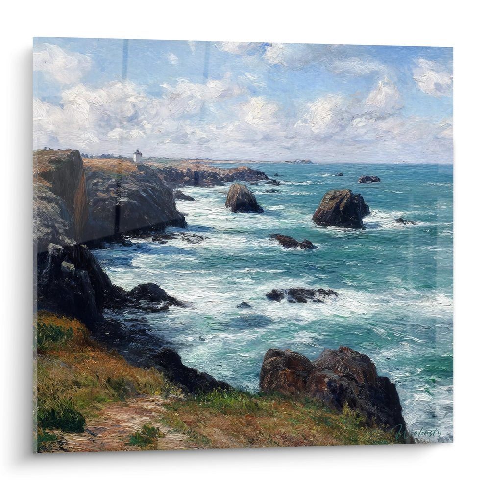 Cette composition s'inscrit dans la tradition des paysages marins impressionnistes français, évoquant les œuvres de Claude Monet à Belle-Île ou les toiles de Maxime Maufra en Bretagne. Le traitement pictural des embruns et la captation de la lumière atlantique rappellent l'école de Pont-Aven et les peintres de la côte bretonne. Cette œuvre d'art maritime contemporaine perpétue l'héritage des grands maîtres tout en offrant une vision moderne de la beauté côtière française.