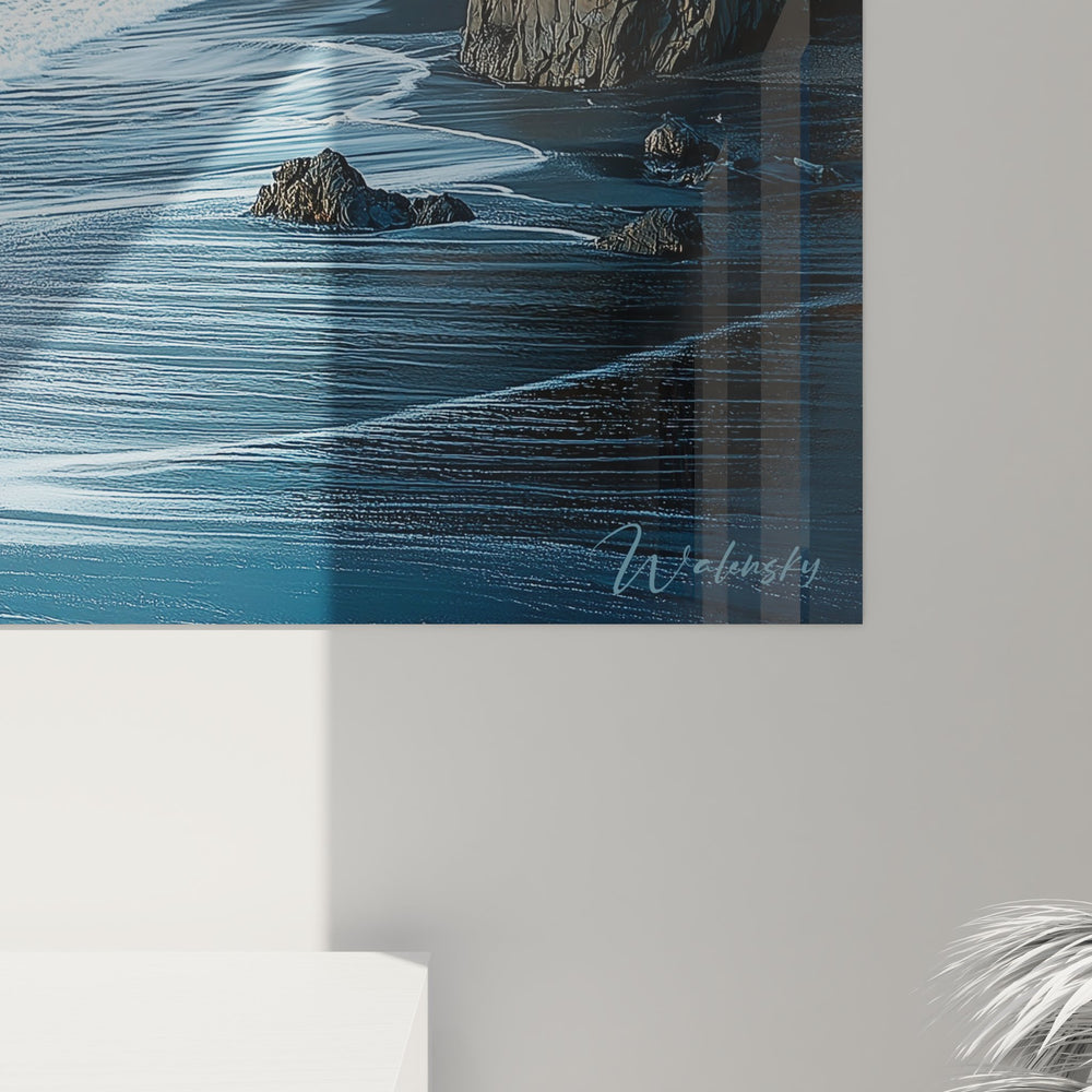 Cette création s'inscrit dans la tradition des grands maîtres du paysage maritime, rappelant l'œuvre de Caspar David Friedrich et sa vision romantique de la nature. Le style photographique hyperréaliste évoque également les travaux contemporains de photographes paysagistes comme Marc Adamus. Ce tableau moderne plage s'apparente aux œuvres célébrant la beauté brute des côtes atlantiques, dans l'esprit des paysages marins de William Turner ou des compositions dramatiques d'Ansel Adams.