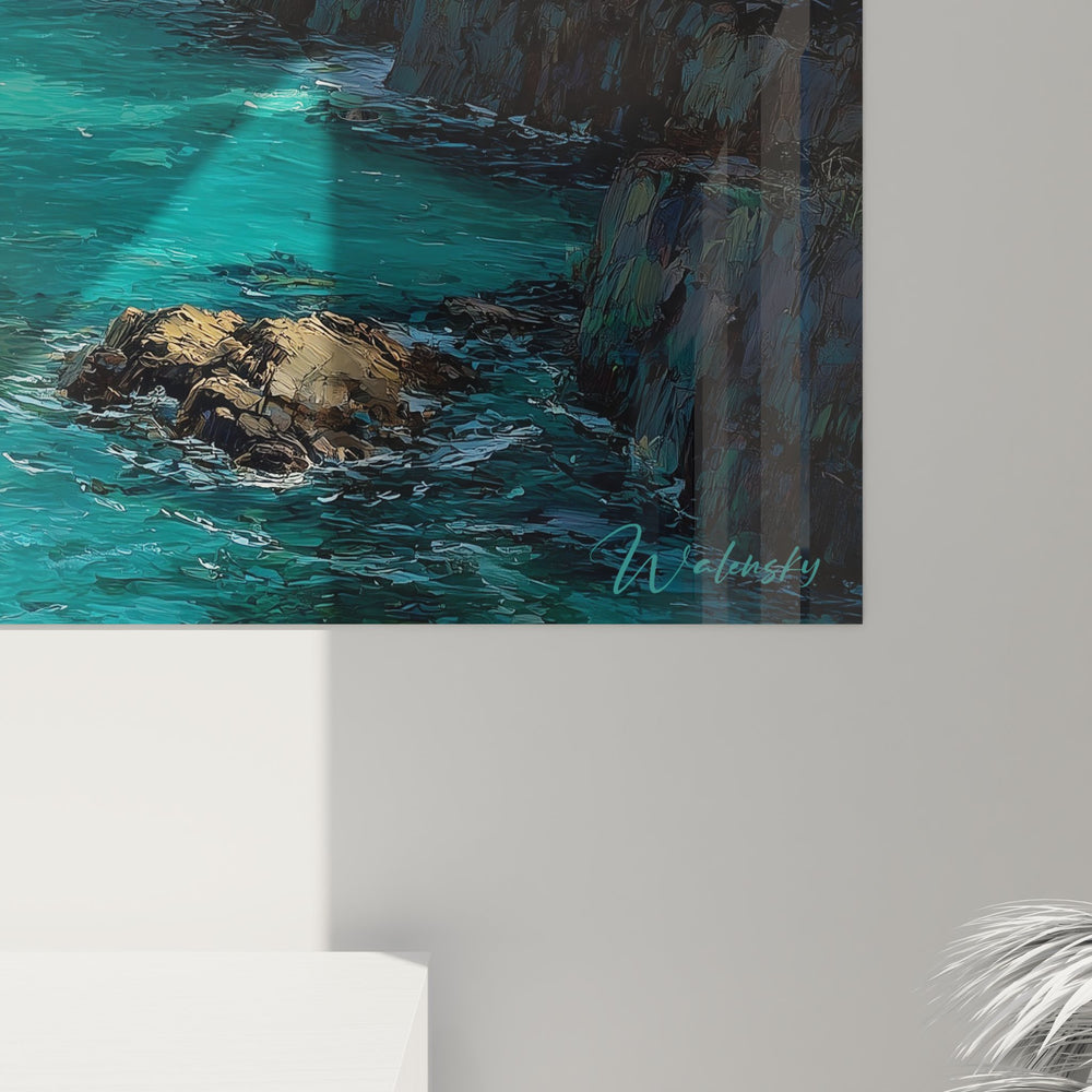 Tags : tableau plage turquoise, décoration côte tropicale, art mural océan, paysage rocheux marin, tableau eaux cristallines