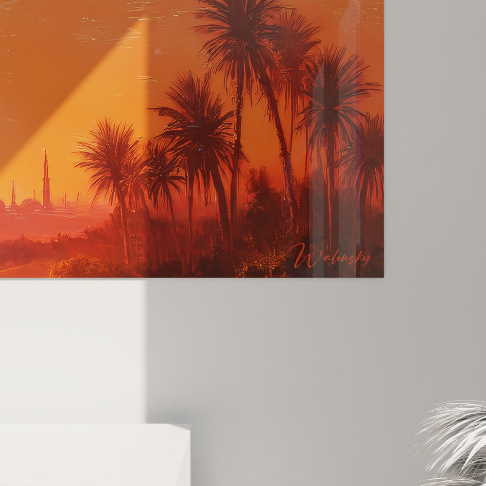 La palette orangée désert de cette œuvre évoque la chaleur et la spiritualité de l'Orient. Les tons cuivrés et dorés symbolisent l'opulence et la sagesse, tandis que les silhouettes sombres des mosquées représentent la foi et la tradition. Cette ambiance désert oriental crée une atmosphère méditative propice à la contemplation et à l'évasion vers des horizons lointains.