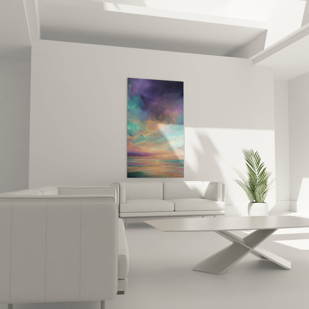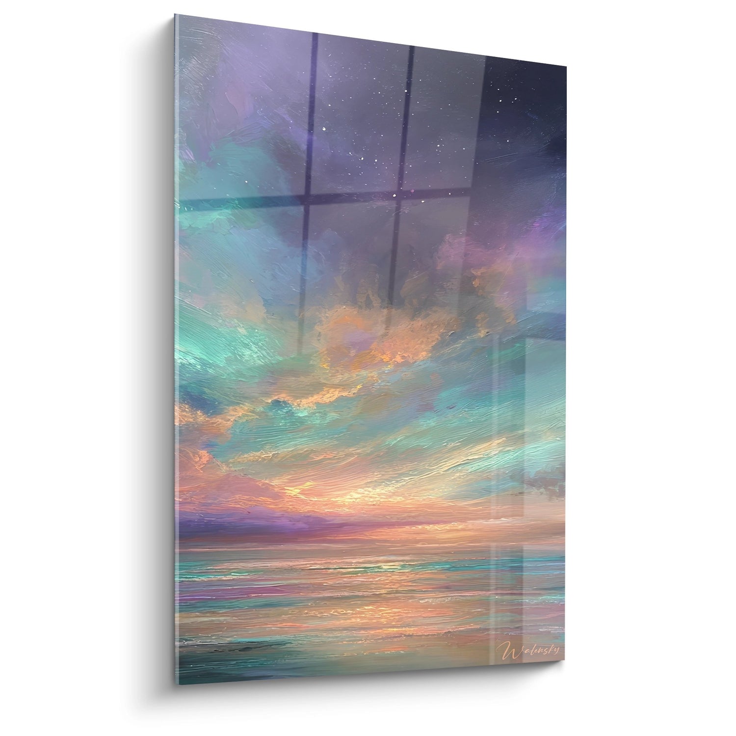 Ce magnifique tableau mural coucher de soleil capture la beauté éthérée d'un ciel nocturne aux nuances d'aurore boréale. L'œuvre présente un paysage océanique fantastique où se mélangent harmonieusement les teintes violettes, turquoises et dorées caractéristiques des phénomènes lumineux polaires. La composition révèle un horizon marin baigné de reflets chatoyants, où les vagues scintillent sous un ciel étoilé multicolore. Les nuages volumineux, peints dans des tons de corail et d'améthyste, créent une atmosphère mystique et apaisante. Ce tableau aurore boréale océan transporte le spectateur vers un monde onirique où la nature dévoile sa splendeur la plus spectaculaire. L'artiste a su maîtriser les jeux de lumière pour créer une profondeur saisissante, faisant de cette peinture coucher soleil moderne une pièce maîtresse pour toute décoration contemporaine. Les reflets dorés qui se dispersent à la surface de l'eau apportent une dimension chaleureuse à cette œuvre d'art mural nordique, créant un équilibre parfait entre fraîcheur et luminosité.
