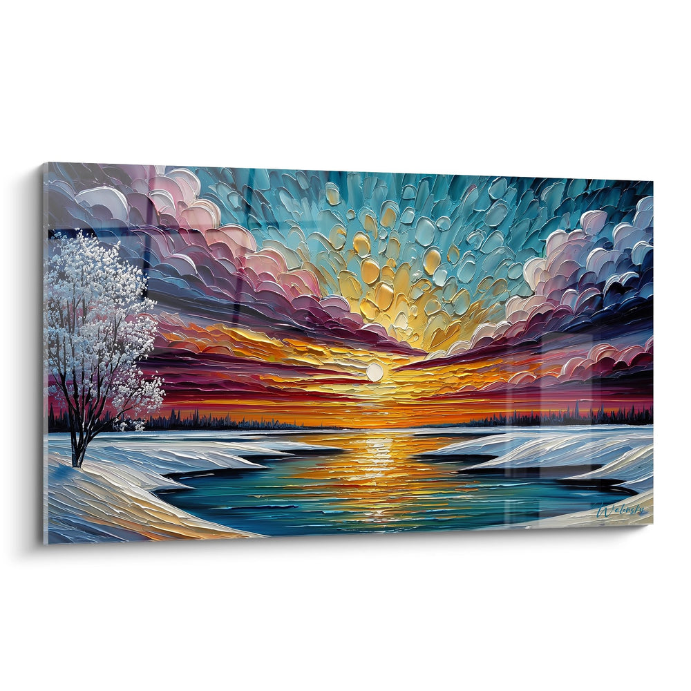 Ce tableau mural coucher de soleil présente une vision spectaculaire d'un paysage hivernal baigné dans les dernières lueurs du jour. L'œuvre capture avec une précision saisissante un lac gelé reflétant les couleurs chatoyantes d'un ciel en ébullition. Au centre de la composition, le soleil descend majestueusement vers l'horizon, diffusant ses rayons dorés à travers un ciel dramatiquement structuré en nuages stylisés aux teintes violettes, roses et turquoise. Cette peinture paysage hivernal moderne révèle une technique artistique unique où chaque élément semble sculpté dans la matière picturale. Le tableau lac gelé avec reflets montre une surface glacée qui capte et renvoie les couleurs du ciel dans un jeu de miroir parfait. Sur la gauche, un arbre dépouillé aux branches délicates, couvert de givre, apporte une note de poésie à cette scène hivernale. La décoration murale paysage coucher soleil s'impose comme une fenêtre ouverte sur un monde où la nature déploie sa beauté dans un moment de grâce absolue. Les reflets orangés et dorés du soleil se mêlent harmonieusement aux tons froids du paysage gelé, créant un contraste saisissant qui donne toute sa force à cette œuvre d'art murale soleil couchant.