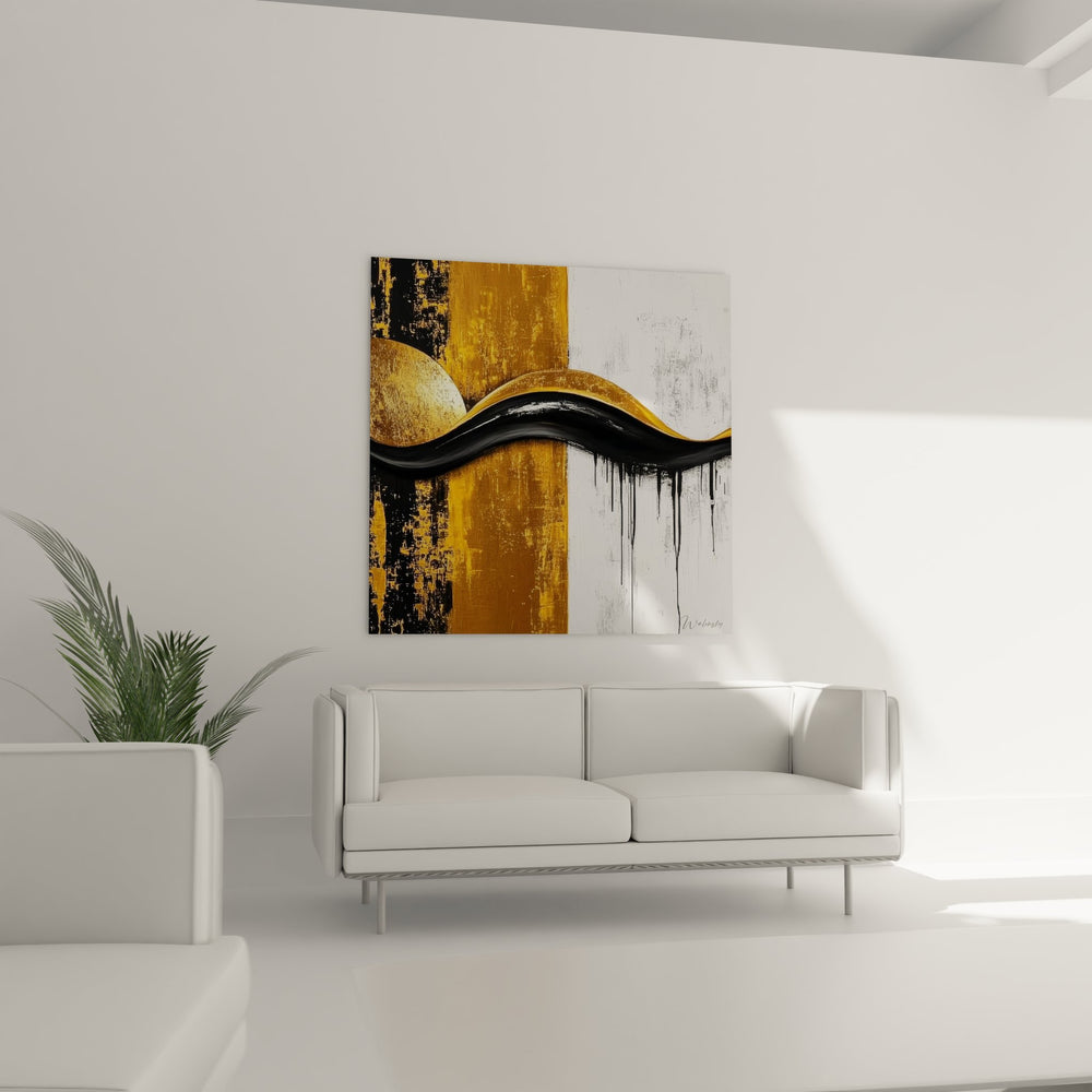 La symbolique de l'or dans cette œuvre évoque la richesse, la transformation et l'élévation spirituelle. Les nuances dorées, du jaune moutarde au bronze profond, créent une gamme chromatique luxueuse contrastée par les noirs profonds. Cette palette couleurs modernes exprime le mouvement perpétuel et la fluidité de la vie, symbolisant l'abondance et l'énergie créatrice qui transforme la matière brute en beauté pure.