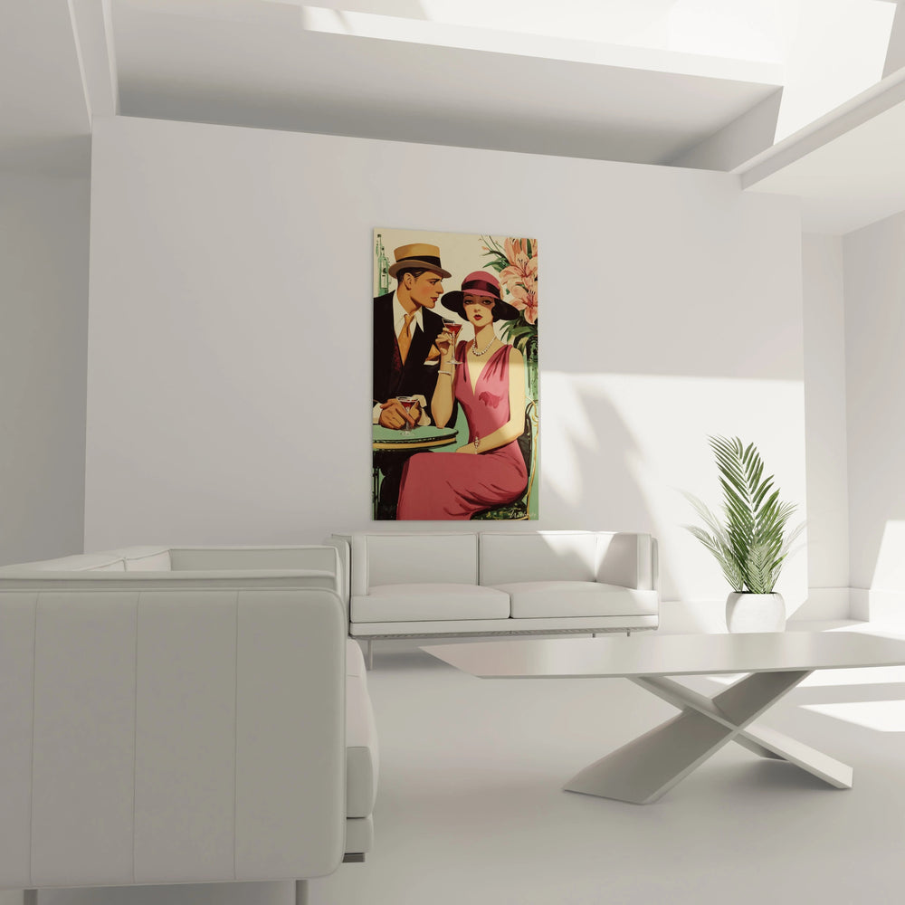Ce tableau mural vintage capture l'essence raffinée des années 1920 à travers la représentation d'un couple élégant savourant l'art de vivre à la française. L'œuvre dépeint un homme distingué en costume sombre, coiffé d'un canotier caractéristique de l'époque, tenant délicatement un cocktail rouge. À ses côtés, une femme incarnant la sophistication des années folles porte une robe rose fluide et un chapeau cloche assorti, accessoires emblématiques de la mode vintage. Ses bijoux de perles blanches et son élégant bracelet complètent cette tenue d'époque parfaitement orchestrée.