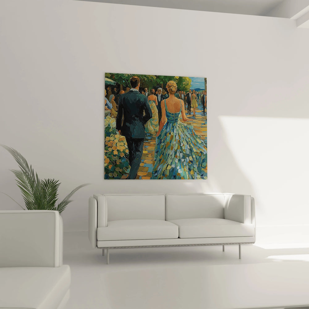 Ce magnifique tableau mural couple élégant capture l'essence d'une soirée tropicale d'exception, où l'élégance rencontre l'exotisme dans une harmonie parfaite. L'œuvre dépeint un couple sophistiqué évoluant dans un cadre naturel luxuriant, incarnant le raffinement de la haute couture dans un environnement paradisiaque. L'homme, vêtu d'un smoking noir impeccable, accompagne sa compagne qui porte une robe longue aux reflets bleu-vert chatoyants, créant un contraste saisissant avec la végétation tropicale environnante. Cette représentation artistique transforme n'importe quel espace en galerie d'art contemporain, apportant une touche de glamour et de sophistication à votre décoration murale tropicale. La technique picturale employée rappelle les maîtres impressionnistes, avec des touches de couleur visibles qui donnent vie à la scène. Le chemin pavé de pierres dorées guide le regard vers l'arrière-plan où d'autres invités en tenue de gala participent à cette réception mondaine. Cette œuvre d'art mural élégante sublime l'art de vivre à la française, mêlant élégance parisienne et douceur tropicale dans une composition équilibrée et harmonieuse.