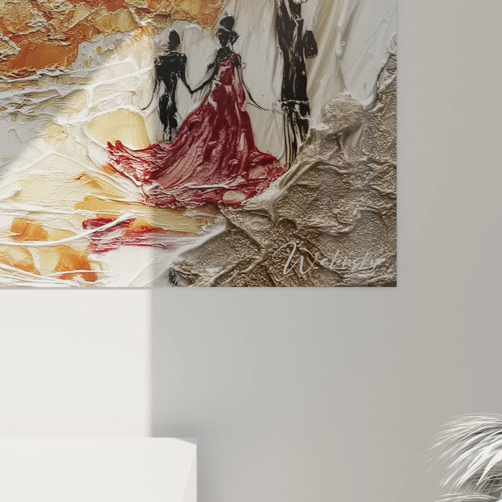L'unicité de cette œuvre réside dans sa capacité à fusionner le classique et le contemporain à travers une gestuelle théâtrale saisissante. Les robes aux volumes exagérés créent un mouvement figé dans le temps, comme une photographie d'un ballet architectural. Les silhouettes mystérieuses dispersées dans la composition ajoutent une dimension narrative que peu d'œuvres possèdent. La signature visible atteste de l'authenticité de cette création originale. Cette art mural couple se distingue par son caractère spectaculaire qui transforme n'importe quel espace en véritable scène d'opéra, créant une atmosphère unique impossible à reproduire avec d'autres décorations murales.