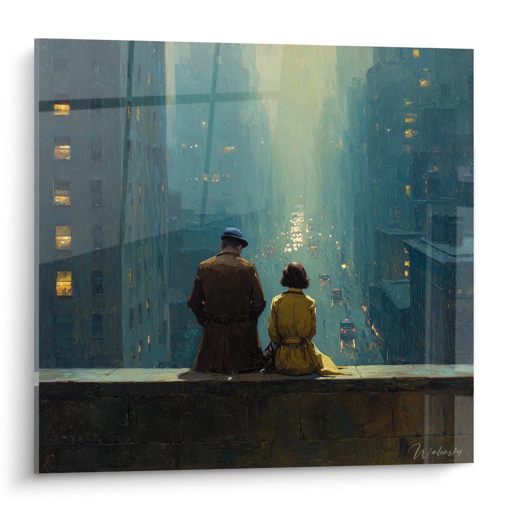 Ce tableau mural New York romantique capture un moment d'intimité urbaine d'une beauté saisissante. L'œuvre dépeint un couple contemplant la ville depuis un point d'observation élevé, offrant une perspective plongeante sur les rues illuminées de Manhattan. L'homme, vêtu d'un long manteau sombre et coiffé d'un chapeau, se tient aux côtés d'une femme en imperméable ocre, tous deux assis sur ce qui semble être un muret ou une corniche. Cette scène urbaine nocturne baigne dans une atmosphère brumeuse et mystérieuse, où les lumières dorées des fenêtres percent l'obscurité bleutée. Les gratte-ciels s'élèvent de part et d'autre, créant une perspective vertigineuse qui guide le regard vers les profondeurs de la métropole. L'artiste a su saisir l'essence même de l'art urbain romantique, où la solitude à deux prend tout son sens face à l'immensité de la ville qui ne dort jamais. Les reflets urbains dorés créent un contraste saisissant avec les tons froids de la nuit, conférant à ce tableau décoratif New York une dimension poétique exceptionnelle.