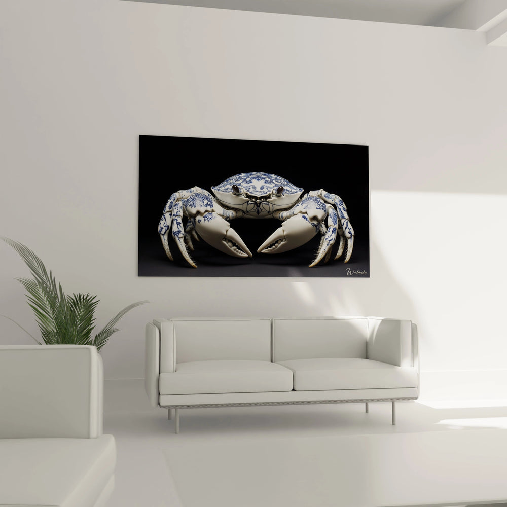 Imaginez un crustacé sculptural qui semble prêt à s’animer sous vos yeux, ses pinces vigoureuses encadrées d’ornements fins qui captivent le regard. Chaque élément de ce tableau évoque le ballet des vagues, la pureté du blanc céramique et l’intensité profonde du bleu cobalt, offrant une expérience visuelle immersive. La sensation est presque tactile : vous pourriez presque sentir la texture lisse de la carapace et l’éclat précieux qui semble émaner de l’œuvre.