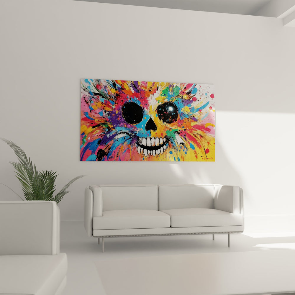 Ce tableau mural crâne explosif présente une œuvre saisissante où la mort rencontre la vie dans une explosion de couleurs vibrantes. Au centre de la composition, un crâne souriant aux orbites noires profondes comme l'espace cosmique émerge d'un chaos chromatique spectaculaire. Les couleurs vives éclaboussées - rose fuchsia, bleu cyan, orange flamboyant, vert émeraude, violet royal et jaune solaire - jaillissent autour du crâne dans un mouvement dynamique rappelant une supernova artistique. Cette peinture abstraite contemporaine transforme le symbole traditionnel de la mortalité en une célébration explosive de la créativité. Les projections de peinture créent un effet de mouvement centrifuge, comme si l'énergie vitale s'échappait du crâne pour envahir l'espace environnant. Le contraste saisissant entre les zones sombres du crâne et l'explosion multicolore crée une tension visuelle captivante. Cette œuvre d'art mural moderne s'inscrit parfaitement dans les tendances de l'art urbain contemporain, mêlant esthétique street art et technique picturale raffinée. La signature visible en bas à droite atteste de l'authenticité de cette création artistique originale.