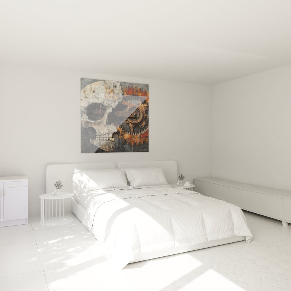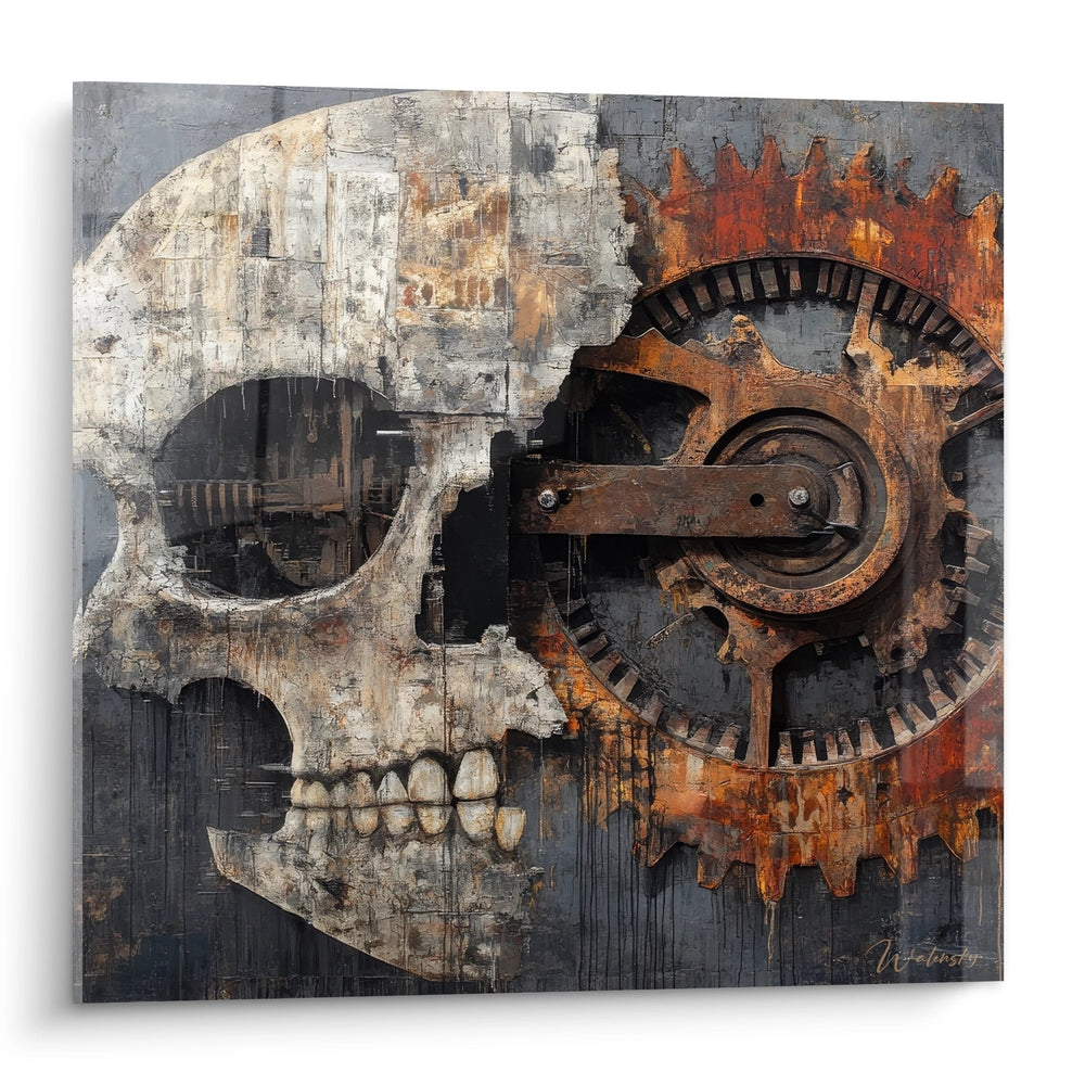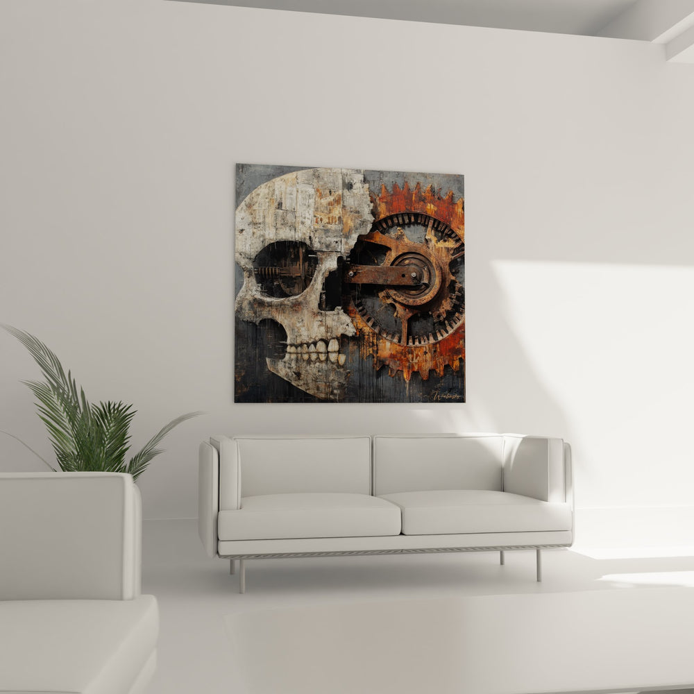 La symbolique de ce tableau crâne industriel puise dans l'iconographie classique de la vanité, réactualisée par l'esthétique steampunk. Les tons rouille évoquent la corrosion du temps, tandis que le blanc cassé de l'os suggère la pureté de la mort. Cette palette chromatique industrielle crée un dialogue visuel entre la fragilité humaine et la robustesse mécanique, questionnant notre rapport à la modernité et à la mortalité dans un monde de plus en plus technologique.