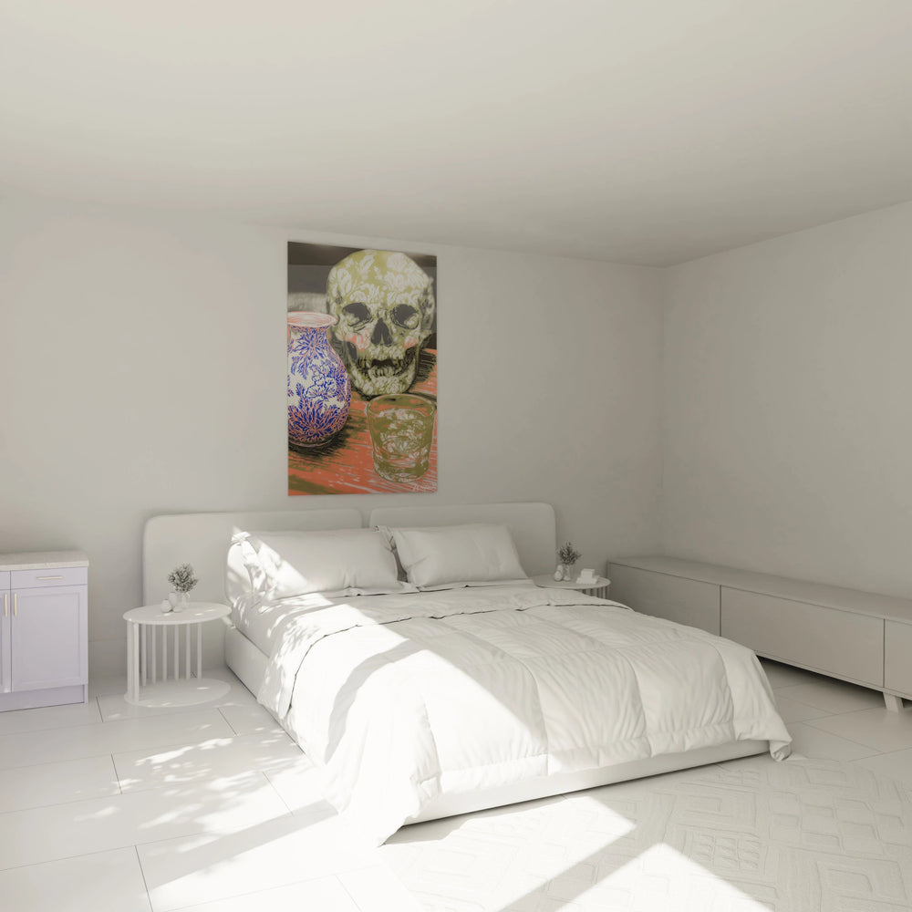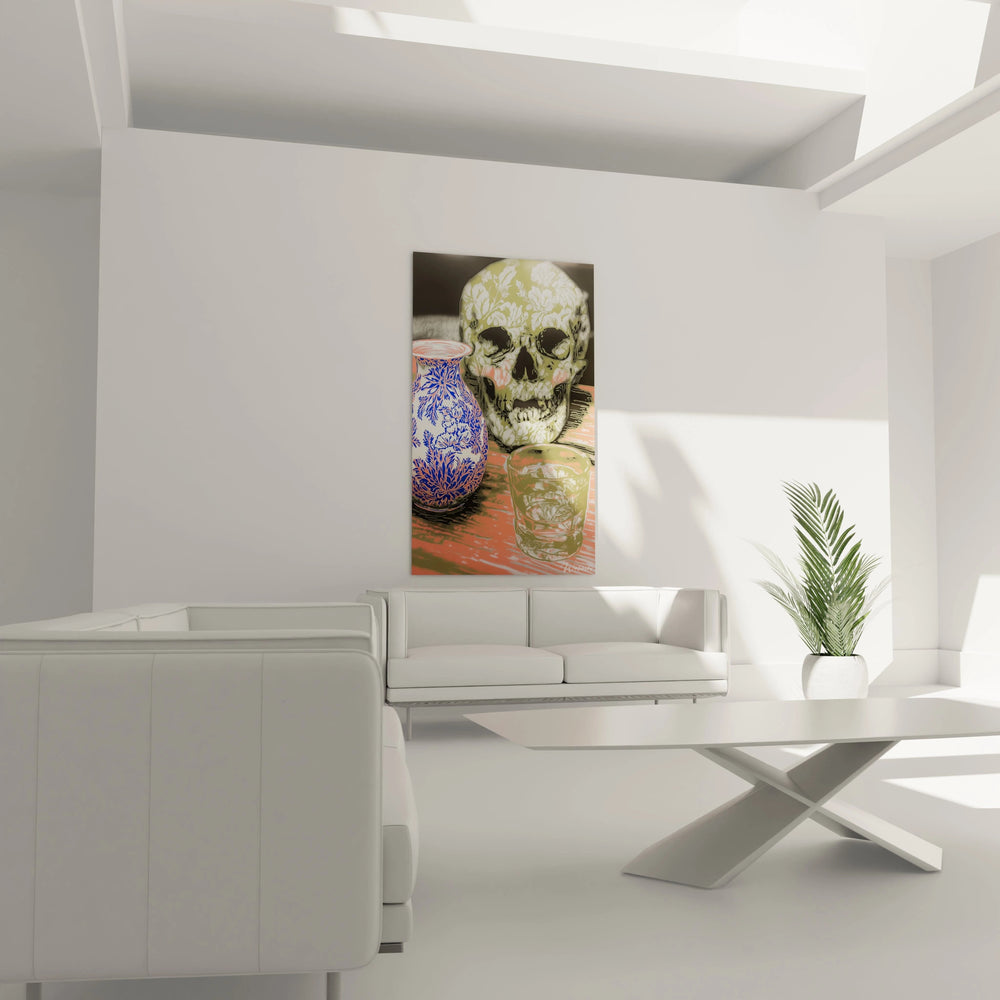 Cette œuvre contemporaine présente un tableau crâne fleuri d'une composition saisissante, où la mort se pare de délicats motifs végétaux blancs sur fond olive. L'image révèle un crâne humain entièrement décoré de feuillages stylisés, créant un contraste poétique entre mortalité et beauté naturelle. Ce tableau crâne motifs botaniques s'impose par sa palette chromatique raffinée, mêlant tons chauds et froids dans une harmonie visuelle remarquable. Les objets du quotidien - vase orné et verre cristallin - complètent cette nature morte moderne, transformant une vanité classique en œuvre décorative contemporaine.
