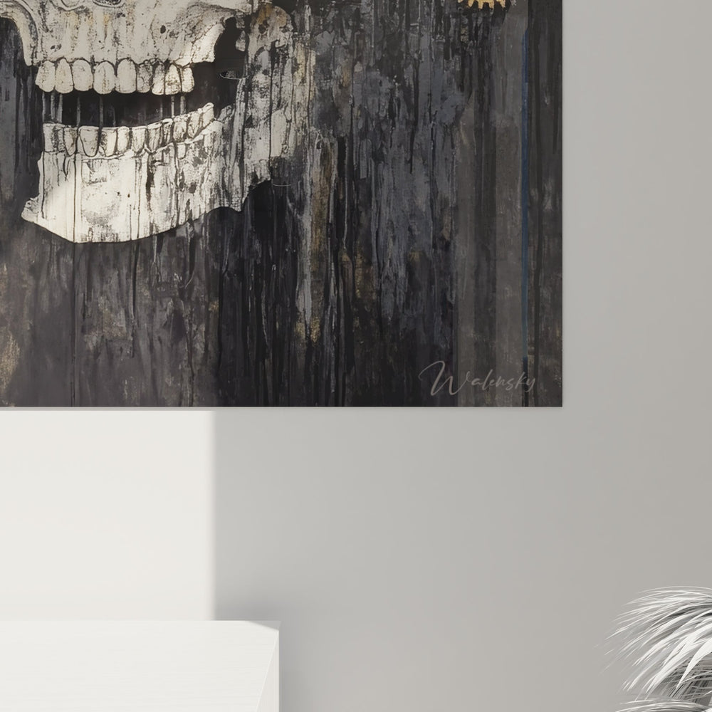 Ce tableau mural crâne steampunk présente une composition saisissante où la mort rencontre l'univers industriel. Au centre de l'œuvre, un crâne blanc vieilli aux orbites profondes et noires domine la toile, créant un contraste frappant avec le fond gris anthracite patiné. La partie droite du crâne révèle un assemblage complexe d'engrenages dorés et de rouages mécaniques, comme si l'intérieur du cerveau était remplacé par une machinerie précise et sophistiquée. Cette décoration murale gothique industrielle mélange habilement les codes esthétiques du steampunk avec une symbolique mortifère. Les mécanismes dorés vintage semblent s'échapper du crâne, créant une dynamique visuelle captivante qui évoque l'idée que même la mort pourrait être mécanisée. L'artiste a utilisé une technique de peinture qui donne un aspect usé et patiné à l'ensemble, renforçant l'atmosphère rétro-futuriste caractéristique de l'art steampunk contemporain. Les détails minutieux des engrenages, avec leurs dents parfaitement dessinées et leurs nuances de bronze et d'or, témoignent d'un travail d'orfèvre. Ce tableau design macabre moderne interroge sur la frontière entre l'organique et le mécanique, questionnant notre rapport à la technologie et à la mortalité dans un style visuel unique et percutant.