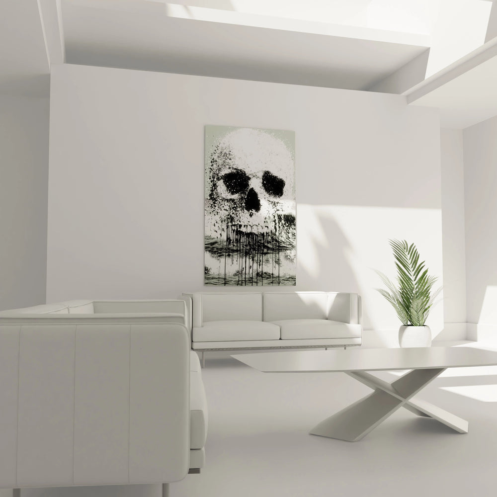 L'œuvre se distingue par son approche non conventionnelle du memento mori classique. Ce tableau crâne technique mixte combine habilement les effets de projection avec un traitement graphique précis. Les orbites creuses se dessinent en négatif, créées par l'absence de matière plutôt que par son ajout. Cette décoration murale crâne coulures exploite brillamment l'espace vide comme élément narratif principal. La dématérialisation progressive du motif vers les bords confère à l'ensemble une dimension spectrale particulièrement évocatrice. L'artiste maîtrise parfaitement l'équilibre entre destruction et construction visuelle.