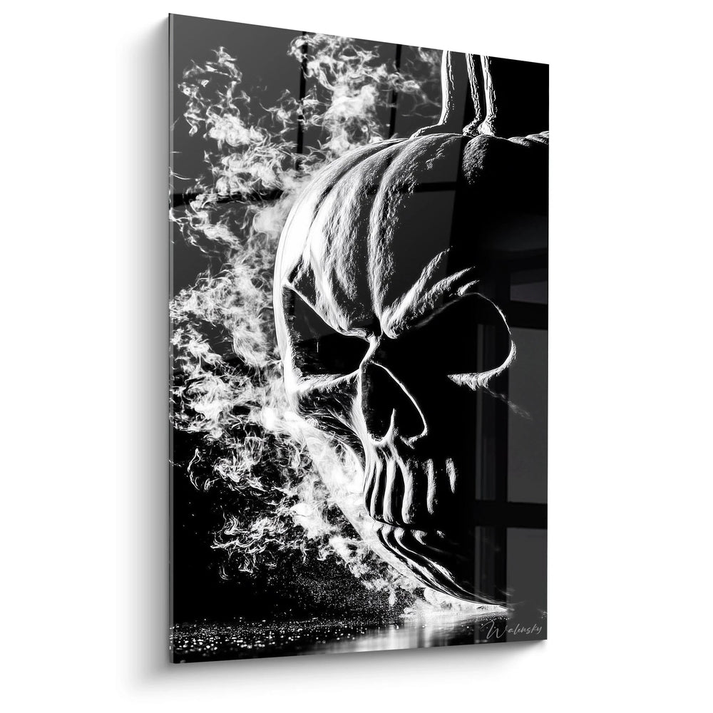 L'unicité de cette œuvre réside dans son traitement particulier du mouvement de la fumée, qui semble littéralement s'échapper des cavités crâniennes comme si l'âme quittait son enveloppe mortelle. Les volutes présentent des formes organiques impossibles à reproduire exactement, chaque courbe et spirale étant le résultat d'un instant figé dans le temps. Cette décoration murale crâne unique se distingue également par la précision anatomique du crâne, où chaque détail correspond à la réalité morphologique humaine. La signature discrète visible en bas à droite authentifie cette œuvre crâne originale, garantissant son caractère exclusif. L'interaction entre les deux éléments principaux crée une narration visuelle qui transcende la simple représentation pour devenir une métaphore poétique de la condition humaine.