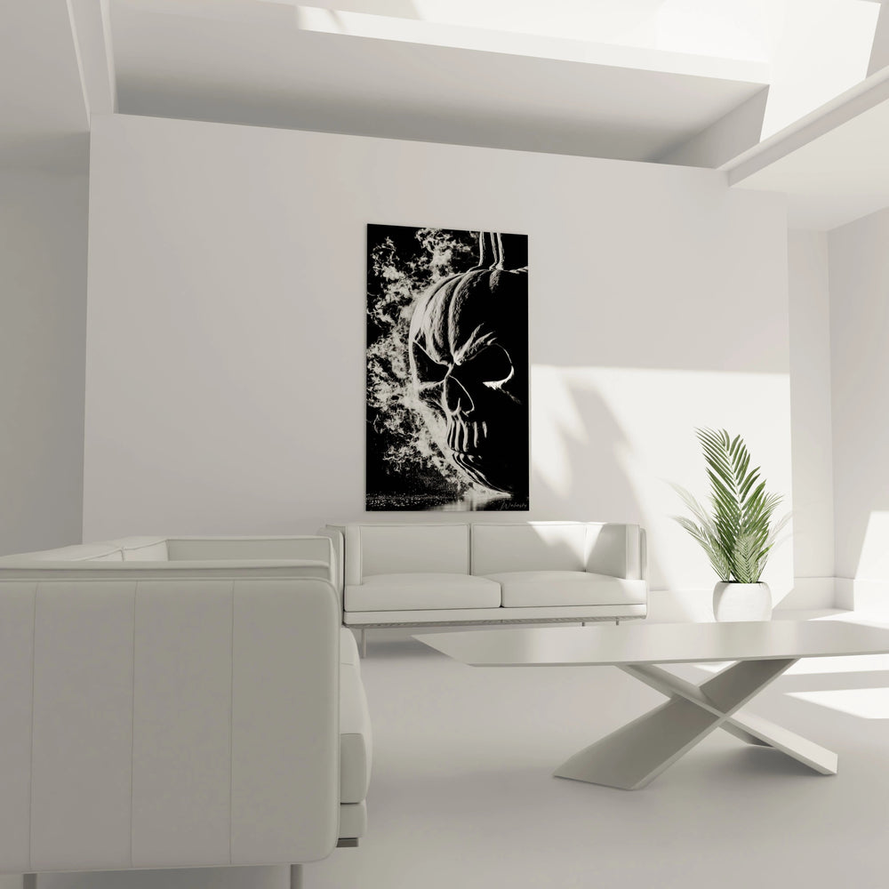 Cette décoration murale crâne sophistiquée trouve sa place idéale dans des environnements où l'éclairage peut être contrôlé avec précision. Un éclairage indirect mettra en valeur les subtilités des nuances de gris sans créer de reflets parasites. Les intérieurs aux tonalités neutres - blancs, gris, ou noirs - complémenteront parfaitement cette œuvre monochrome. Un mur sombre fera ressortir les tons clairs de la fumée, tandis qu'un mur clair accentuera la profondeur des ombres du crâne. Cette art mural crâne premium s'intègre harmonieusement dans les espaces modernes, les bibliothèques, ou les bureaux à l'esthétique contemporaine. L'absence de couleur permet une intégration facile sans risque de conflit chromatique avec le mobilier existant.