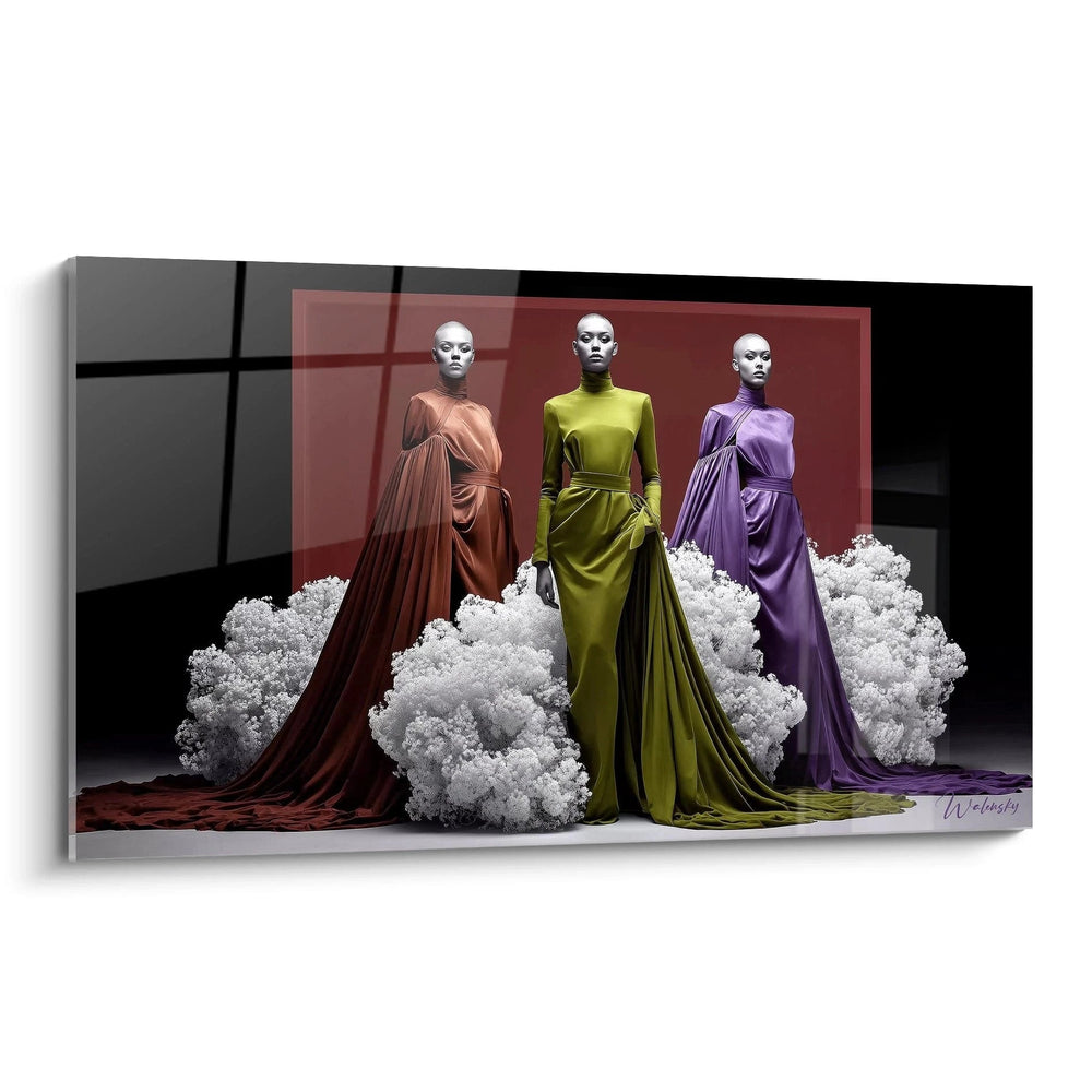 Ce tableau mural haute couture présente une vision artistique saisissante de l'élégance féminine contemporaine. Trois silhouettes statuaires aux crânes rasés se dressent majestueusement dans un décor de mode théâtral, chacune vêtue d'une robe longue couture aux couleurs vibrantes et distinctes. La première figure, positionnée à gauche, porte une création terracotta aux reflets cuivrés, tandis que la silhouette centrale arbore une robe chartreuse éclatante qui capte immédiatement le regard. La troisième personnage, à droite, est sublimée par une robe améthyste aux nuances profondes et mystérieuses.