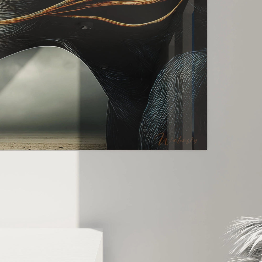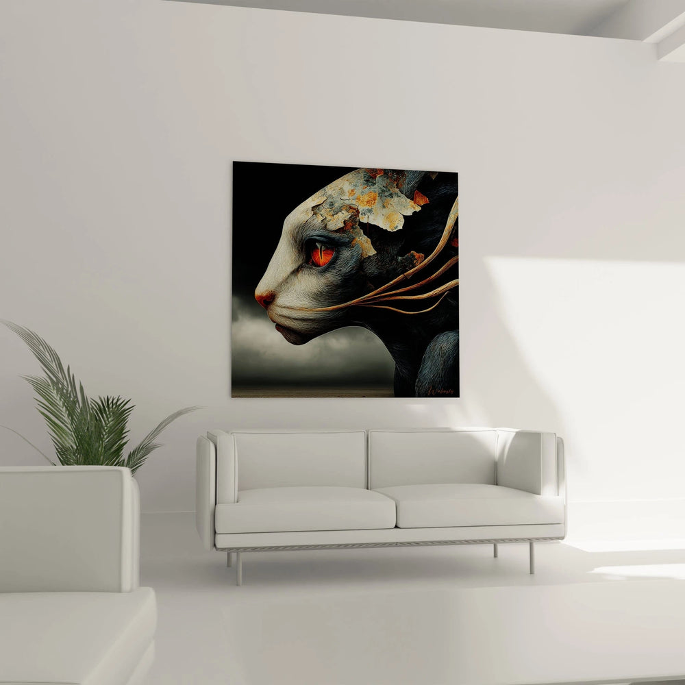 Ce tableau mural créature fantastique présente une représentation saisissante d'un être mystérieux au profil énigmatique. L'œuvre met en scène une créature aux yeux flamboyants d'un rouge intense qui captive immédiatement le regard. La texture de la peau révèle des détails extraordinaires avec ses nuances grises et ses zones de corrosion dorée qui évoquent un processus de métamorphose ancient. Des appendices filiformes dorés s'échappent de la créature, créant un mouvement fluide qui apporte une dimension dynamique à l'ensemble. Le tableau art mystique moderne joue sur les contrastes entre les zones sombres du pelage et les éclats cuivrés qui parsèment la surface. L'arrière-plan volontairement flou met en valeur le sujet principal dans un environnement architectural contemporain. Cette œuvre d'art fantastique murale transforme l'espace en galerie personnelle grâce à son impact visuel remarquable. La technique de rendu hyperréaliste confère une présence troublante à cette créature qui semble observer le spectateur avec une intelligence ancestrale. Ce tableau décoration intérieure originale s'impose comme une pièce maîtresse capable de redéfinir l'atmosphère d'une pièce.