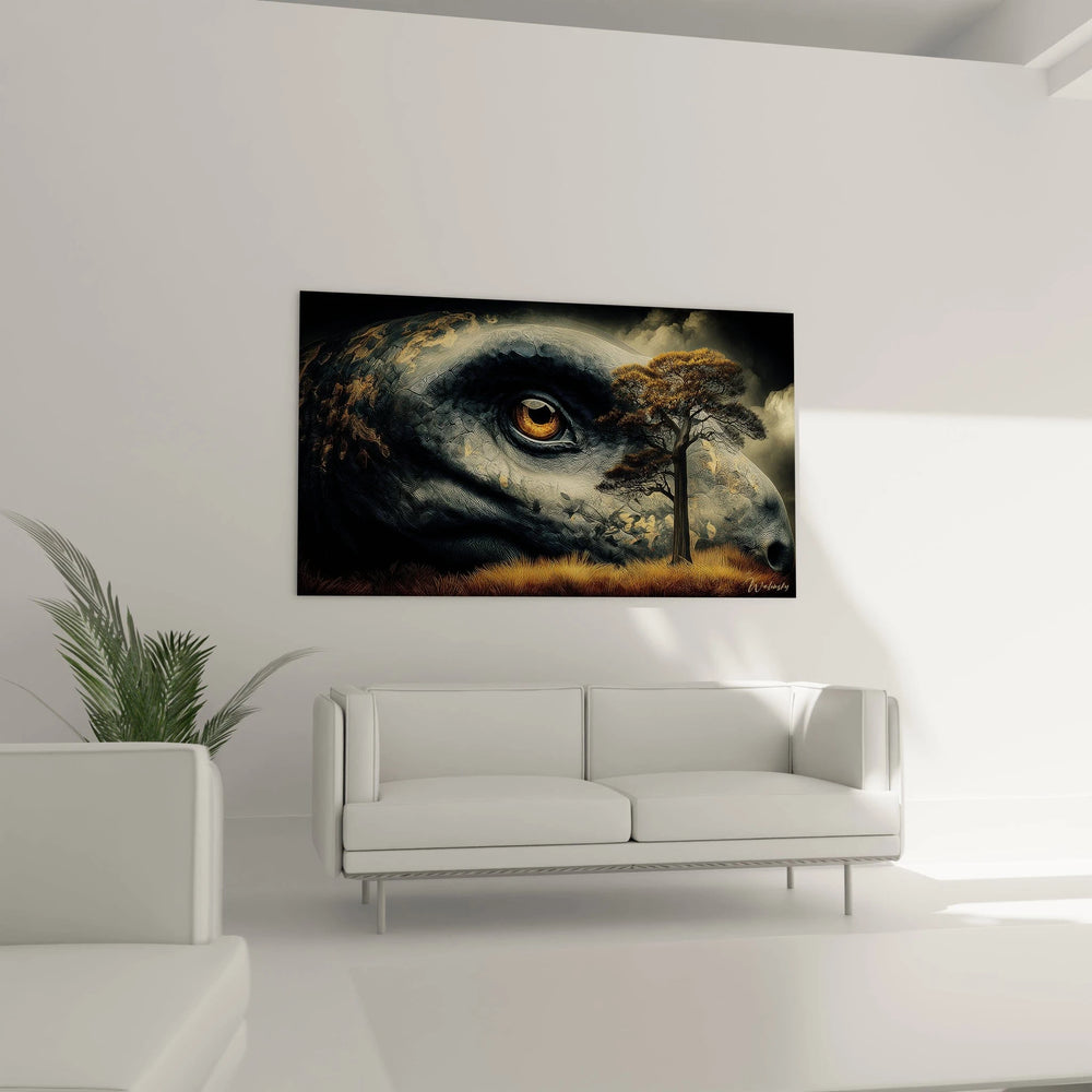 Ce tableau mural Mokele-mbembe présente une représentation saisissante d'une créature préhistorique légendaire au regard pénétrant et mystérieux. L'œuvre capture avec une précision remarquable les détails anatomiques de cette bête mythique africaine, mettant en évidence son œil ambré hypnotique qui semble observer directement le spectateur. La texture reptilienne de la peau est rendue avec un réalisme troublant, révélant chaque ride, chaque pli et chaque nuance de cette créature des marécages congolais. L'artiste a su créer une atmosphère à la fois inquiétante et fascinante, transformant ce tableau cryptozoologie en une véritable fenêtre vers un monde perdu. Les jeux d'ombres et de lumière accentuent le caractère dramatique de la composition, tandis que les détails minutieux de la morphologie révèlent l'expertise technique de l'auteur. Cette œuvre d'art préhistorique s'impose comme une pièce maîtresse de décoration, capable de transformer n'importe quel espace en galerie d'art contemporain. Le tableau mural créature mythique révèle également des influences stylistiques modernes tout en conservant une authenticité primitive saisissante.