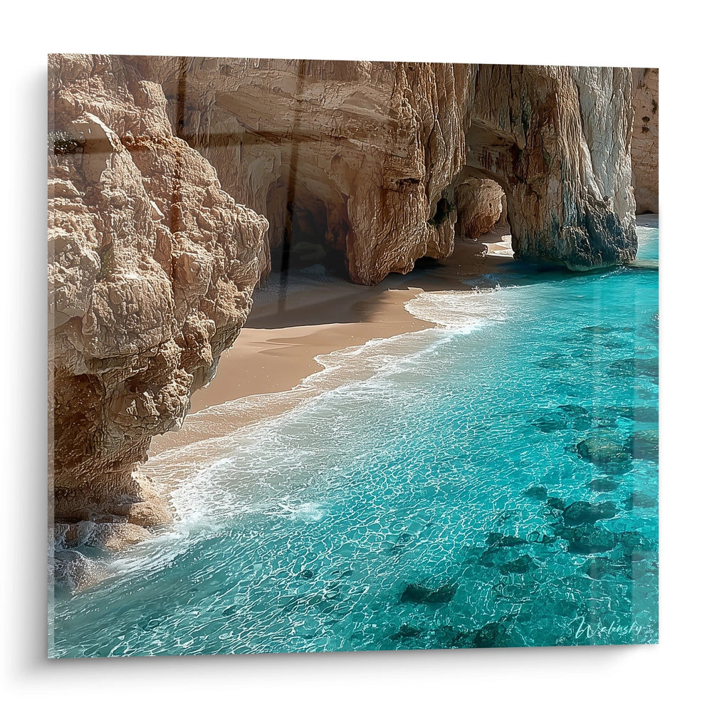 Ce tableau mural crique méditerranéenne capture la beauté saisissante d'une plage secrète nichée entre des falaises de calcaire doré. L'œuvre révèle un paysage côtier d'exception où les eaux turquoise cristallines viennent lécher délicatement le sable fin ocre. Les formations rocheuses sculptées par le temps créent des arches naturelles et des cavités mystérieuses qui encadrent cette crique paradisiaque. La transparence exceptionnelle de l'eau permet d'apercevoir les détails du fond marin, tandis que les vagues douces dessinent des motifs écumeux sur le rivage. Ce tableau décoratif plage transporte instantanément l'observateur vers les plus belles côtes méditerranéennes, évoquant la Sardaigne, les Cyclades ou encore la Côte d'Azur. Les jeux de lumière naturelle subliment les contrastes entre les tons chauds de la roche calcaire et la fraîcheur des tons aqua marines. Cette toile paysage marin offre une fenêtre vers l'évasion, transformant n'importe quel espace en invitation au voyage. La composition équilibrée entre terre et mer crée une harmonie visuelle parfaite, caractéristique des plus beaux tableaux nature marine.