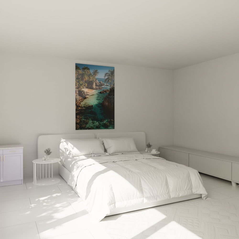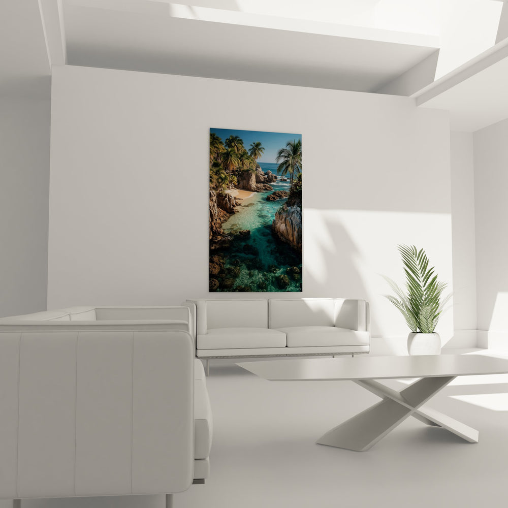 Tags : tableau crique tropicale, lagon turquoise, palmiers exotiques, plage paradisiaque, décoration tropical