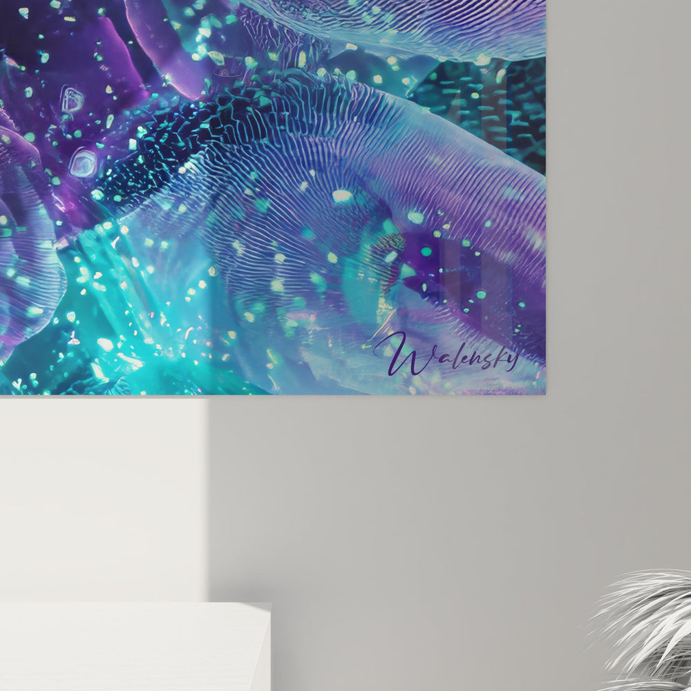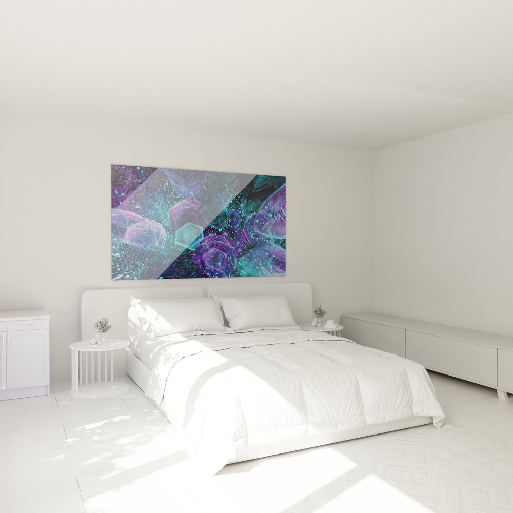 La palette chromatique de ce tableau cristaux abstraits puise dans les nuances violettes symbolisant la transformation spirituelle et l'innovation technologique. Les tons turquoise évoquent la communication digitale et l'intelligence artificielle. Cette œuvre futuriste murale représente l'évolution de la matière vers des formes d'existence digitales, questionnant l'avenir de notre réalité perceptuelle.