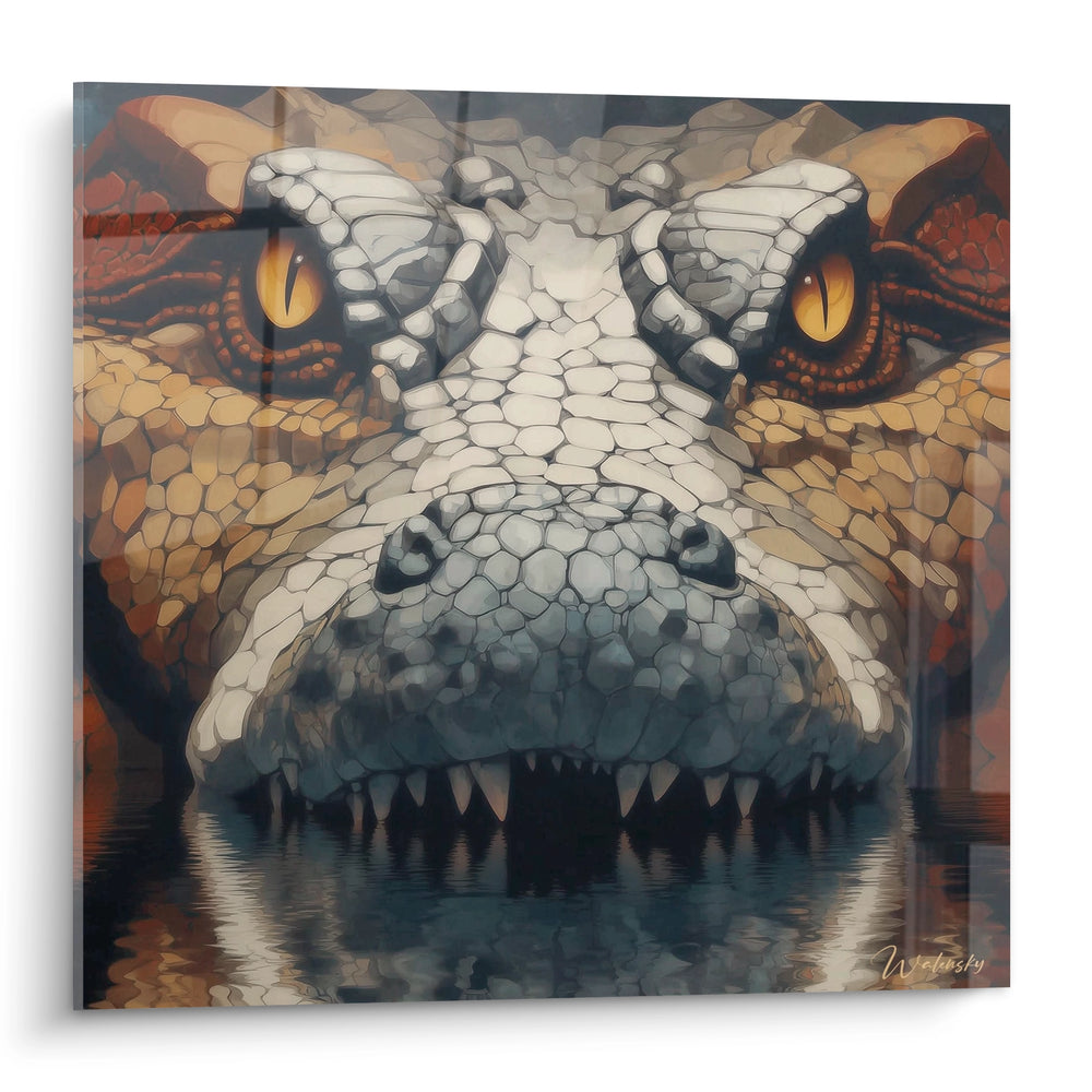 La palette chromatique terrestre évoque les environnements marécageux primitifs avec ses tons ocre, bruns et dorés. Les reflets aquatiques en partie basse symbolisent l'élément naturel du crocodile, créant une atmosphère mystérieuse. Cette art mural animalier véhicule des symboles de force, patience et survie, caractéristiques essentielles de ces reptiles millénaires.