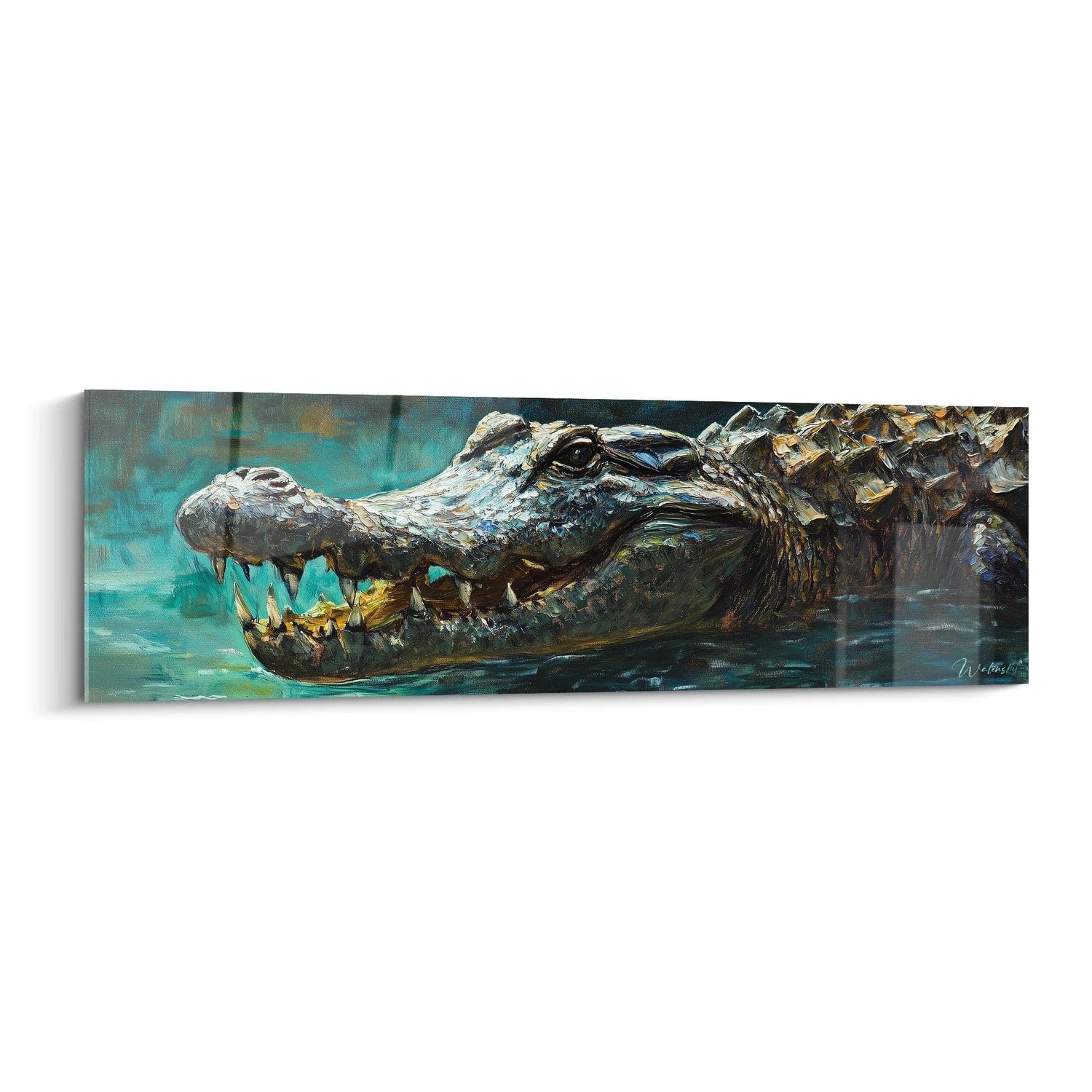 La composition de ce tableau crocodile horizontal adopte un format panoramique qui accentue la longueur naturelle du reptile. L'animal occupe la majeure partie de l'espace, positionne stratégiquement pour créer un impact visuel maximal. La perspective latérale révèle parfaitement le profil caractéristique du crocodile, de son museau allongé jusqu'à sa queue puissante. L'équilibre visuel repose sur la distribution harmonieuse entre la masse corporelle de l'animal et l'espace aquatique environnant. Cette œuvre crocodile utilise intelligemment les lignes directrices naturelles du corps du reptile pour guider le regard à travers toute la largeur du cadre, créant un mouvement fluide et captivant.
