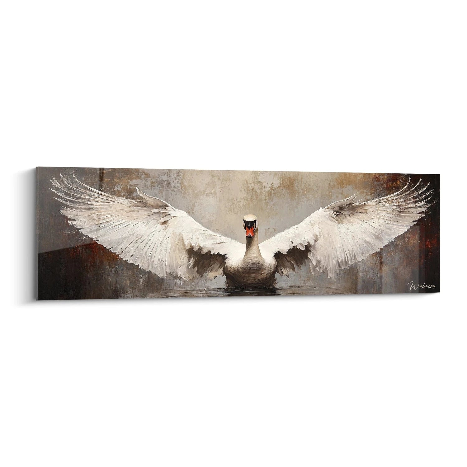 Ce tableau cygne révèle une œuvre d'art captivante où un majestueux cygne blanc déploie ses ailes dans un geste théâtral saisissant. La composition présente l'oiseau au centre d'un format panoramique, créant une impression de mouvement suspendu dans le temps. Le tableau cygne aux ailes déployées capture un moment d'une intensité dramatique remarquable, où chaque plume semble vibrer d'énergie. L'arrière-plan texturé aux tons chauds contraste magnifiquement avec la blancheur immaculée du plumage, créant une profondeur visuelle exceptionnelle. Cette décoration murale cygne exprime une puissance naturelle brute qui transforme immédiatement l'atmosphère d'un espace.