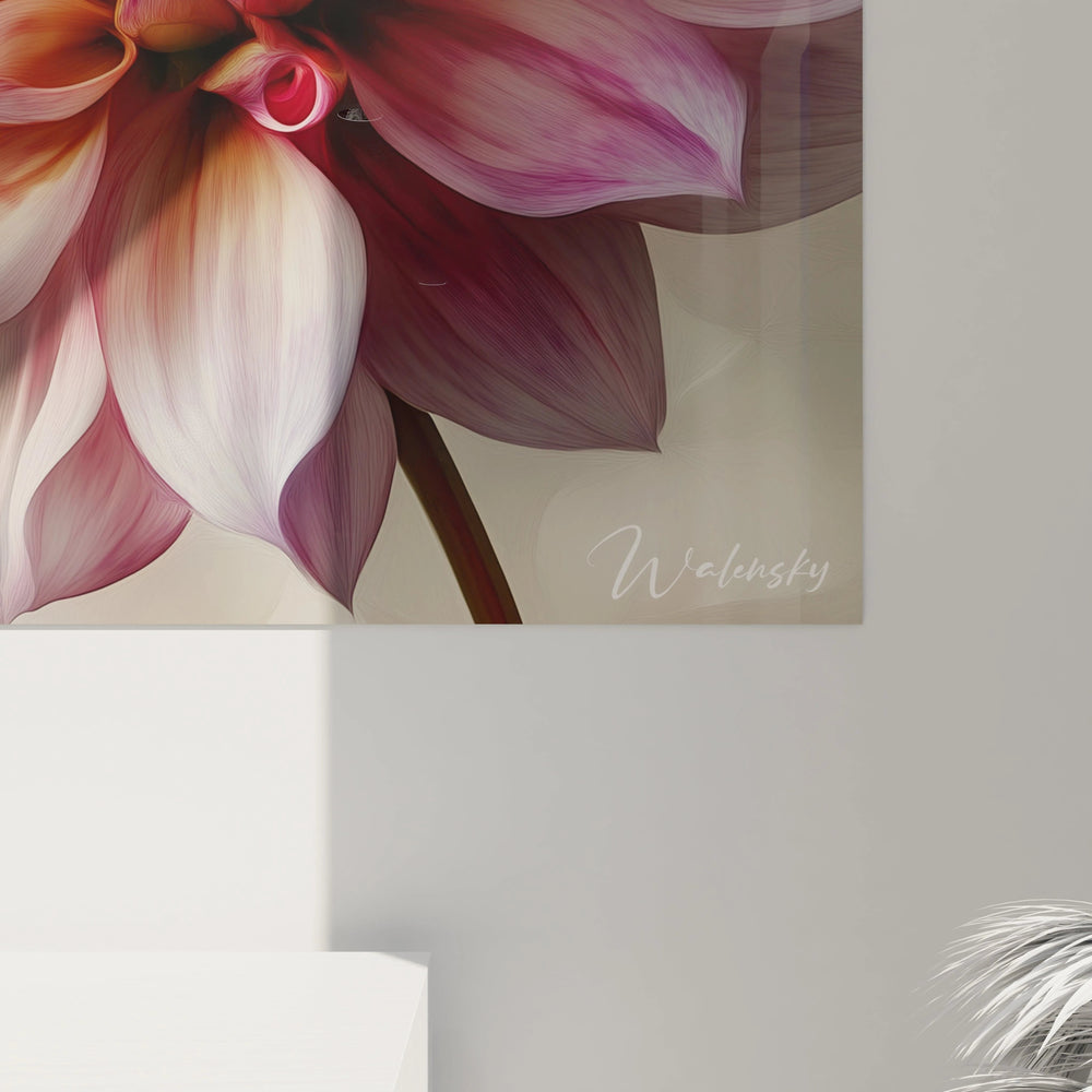 Ce tableau transcende la simple reprĂ©sentation florale pour devenir une vĂ©ritable expĂ©rience visuelle et Ă©motionnelle. Les nuances de rose, dâor rose et de beige sâentrelacent avec Ă©lĂ©gance, enveloppant lâespace dâune douceur chaleureuse, presque tactile. Vous pourrez ressentir la fragilitĂ© et la grĂące du dahlia, cette fleur majestueuse Ă la fois douce et passionnĂ©e.