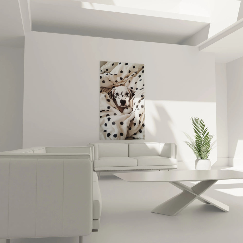 Imaginez un instant ce jeune dalmatien, enveloppé d’un tissu délicatement orné de ses propres taches, comme une étreinte subtile qui conte une histoire de douceur et de protection. Ce tableau unique vous transporte dans un univers où chaque détail invite à la contemplation, mêlant harmonieusement simplicité et raffinement.